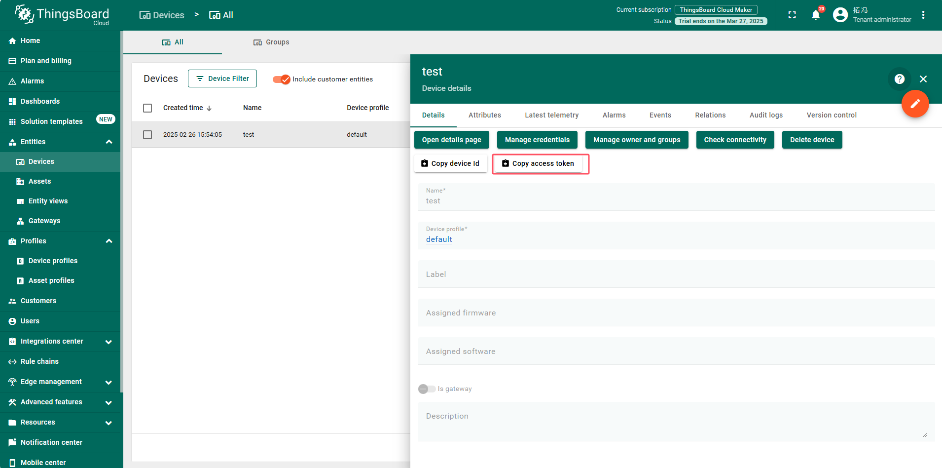 点击设备添加好的设备,点击“copy access token”可以复制用户名,此参数也需要填入DTU参数配置平台。