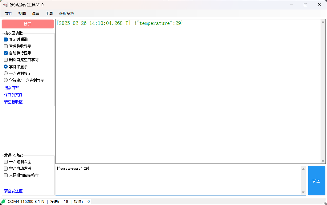 打开串口测试工具,并连接串口发送遥测数据 {"temperature":29}