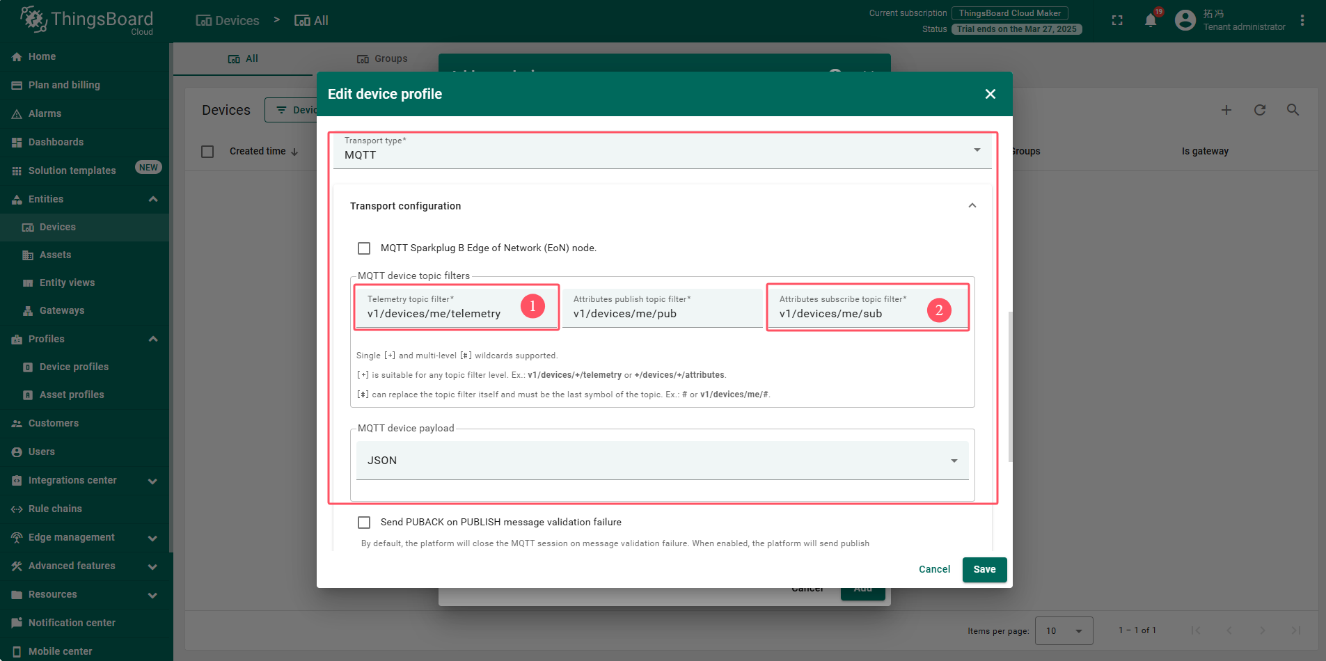 在“网络通道参数”界面根据ThingsBoard Cloud参数填写MQTT参数。