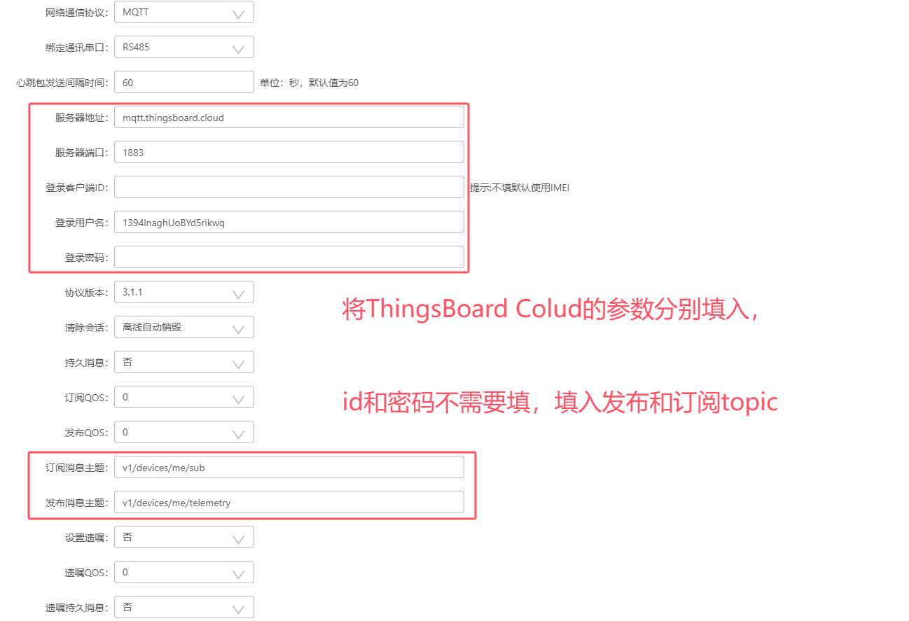 mqtt.thingsboard.cloud 是服务器地址 1883是端口号 这些是MQTT配置参数,需要填入DTU参数配置平台。