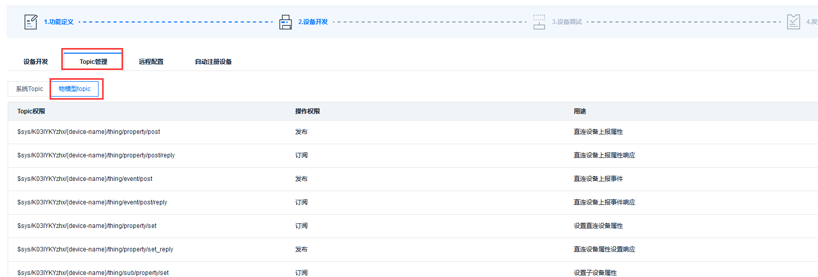 | $sys/K03lYKYzhx/{device-name}/thing/property/post | 发布 | 直连设备上报属性 | |