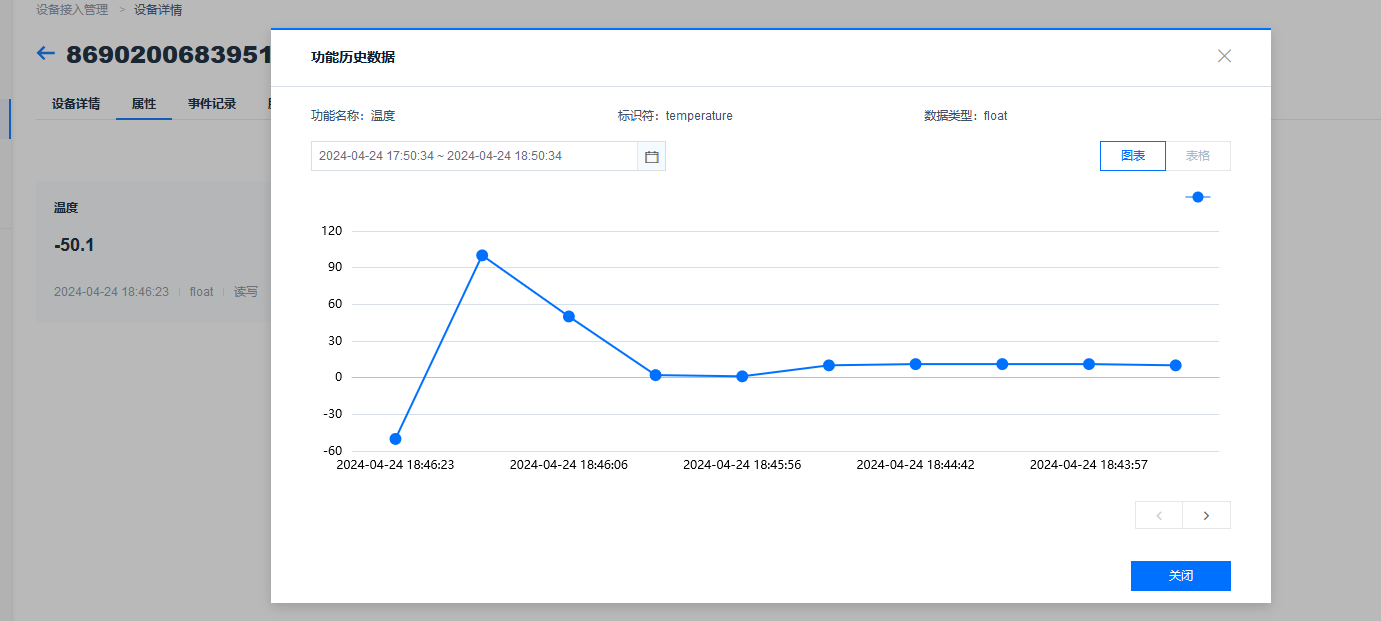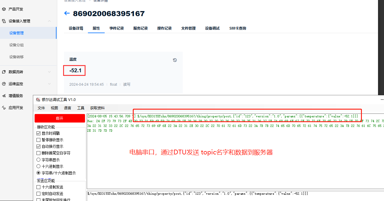 指定topic发布的数据是:$sys/K03lYKYzhx/869020068395167/thing/property/post,{"id":"123","version":"1.0","params":{"temperature":{"value":-52.1}}}