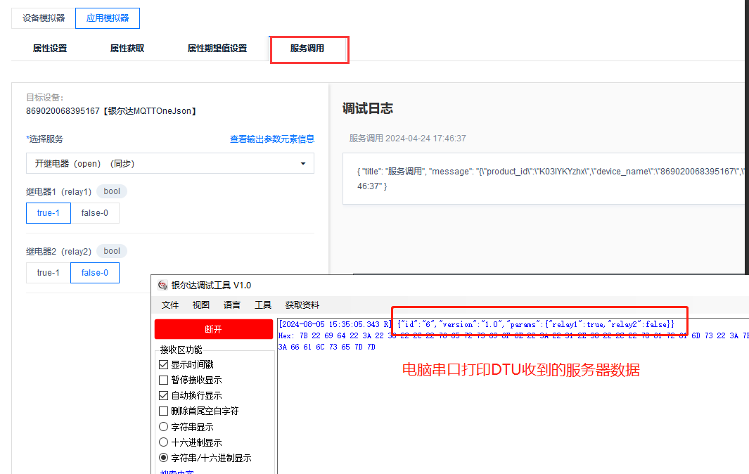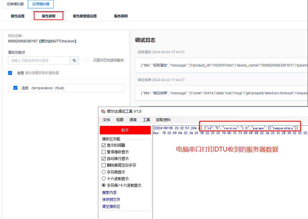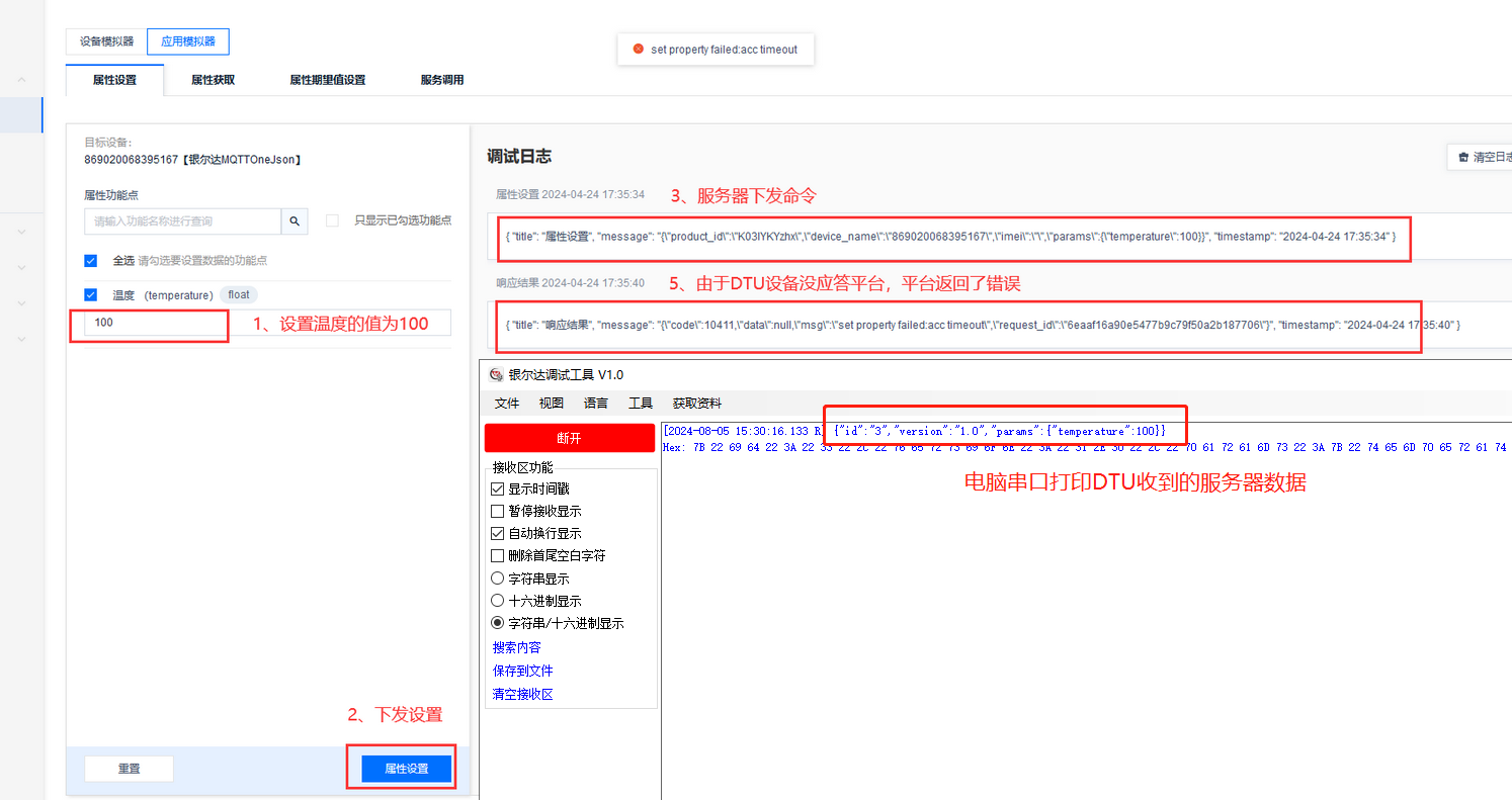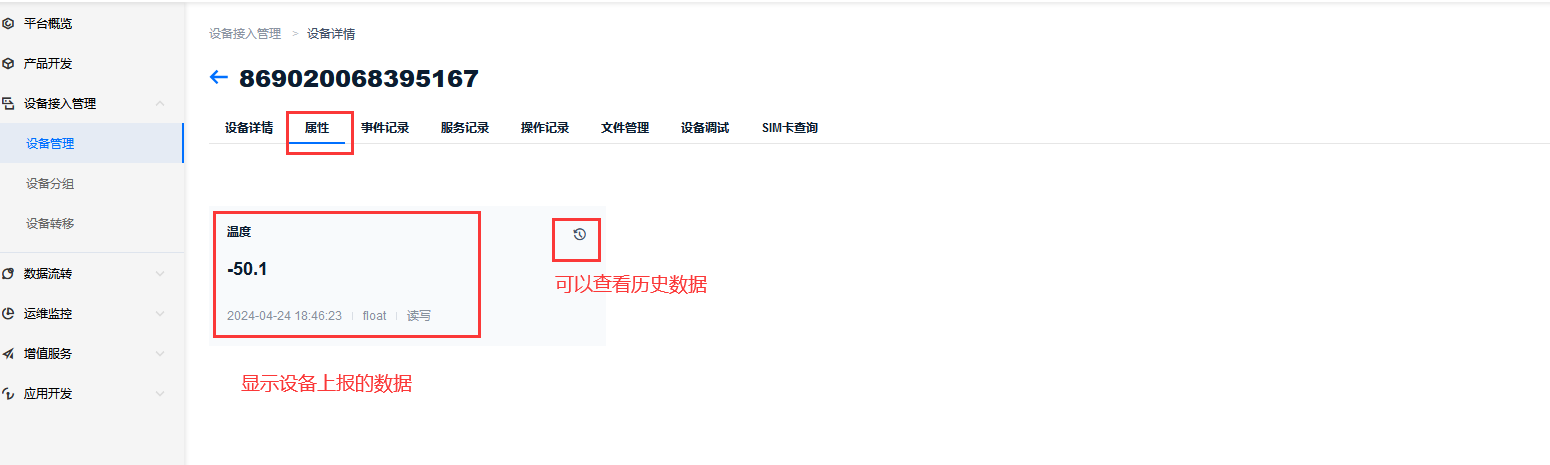 设备列表,进入详情,进入设备调试,引用模拟器,可以设置属性,获取属性,服务调用。平台发送设置属性的数据,串口能收到数据,由于还没启动任务,所以无法自动打印接收topic名称。也无法自动应答服务器,导致服务器会推送下发数据失败。通过调试数据