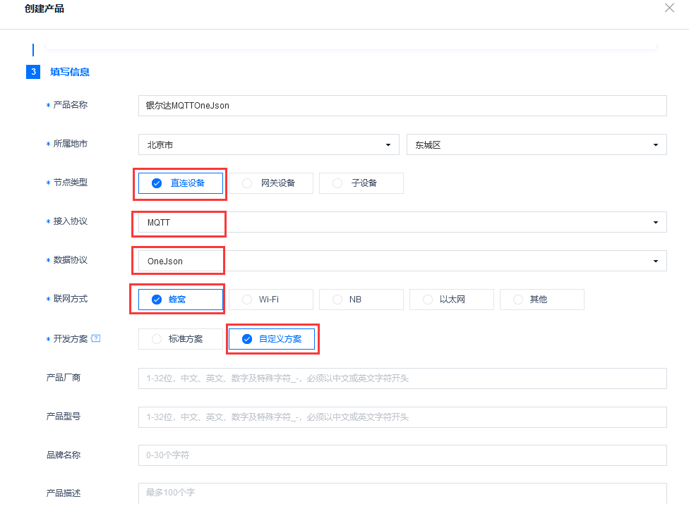 写信息,选择直连设备,MQTT协议,OneJson,蜂窝,自定义方案。
