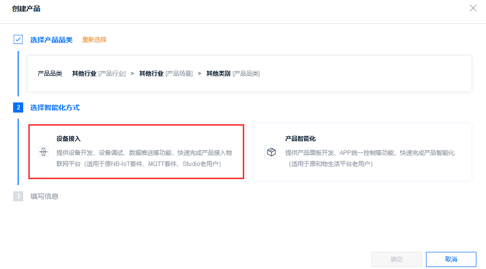 根据需求选择,这里选择产品品类为"其他行业",选择智能化方式为“设备接入”。