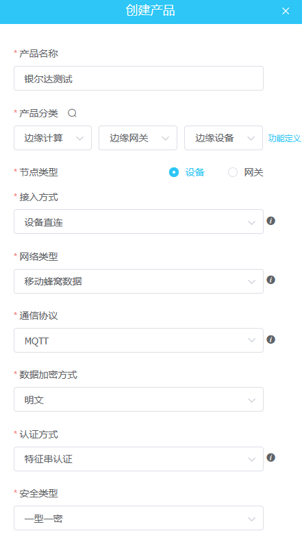 据需求选择,选择产品分类为边缘计算,节点类型设备,接入方法设备直连,网络类型移动蜂窝数据,通讯协议,MQTT,数据加密方法明文,认证方式特征字符串,安全类型一型一密,设备型号任意,是否透传选择透传,消息格式任意,这里选择json。