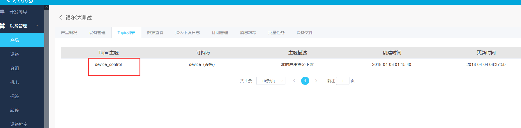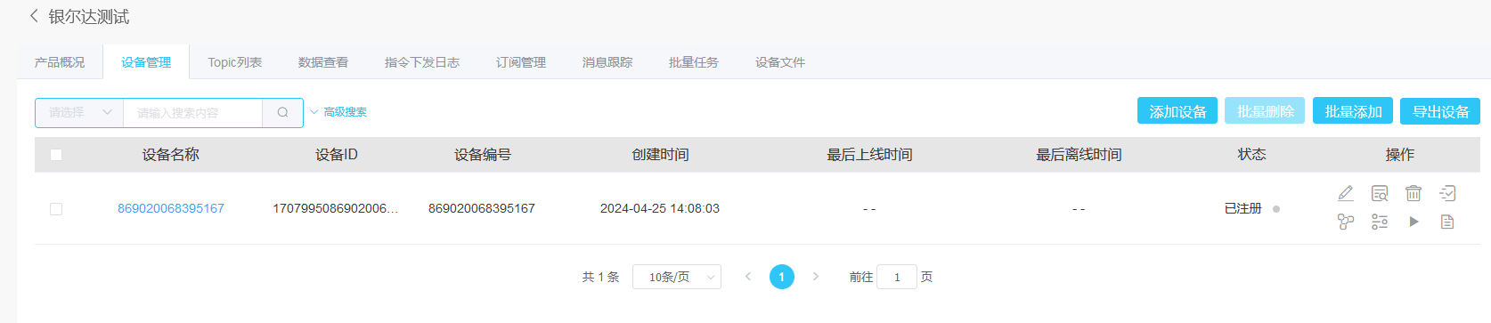 进入topic管理,这里面只有一个订阅topic,填写到DTU的 订阅消息主题 。DTU的发布topic可以任意写,平台都能接收到。