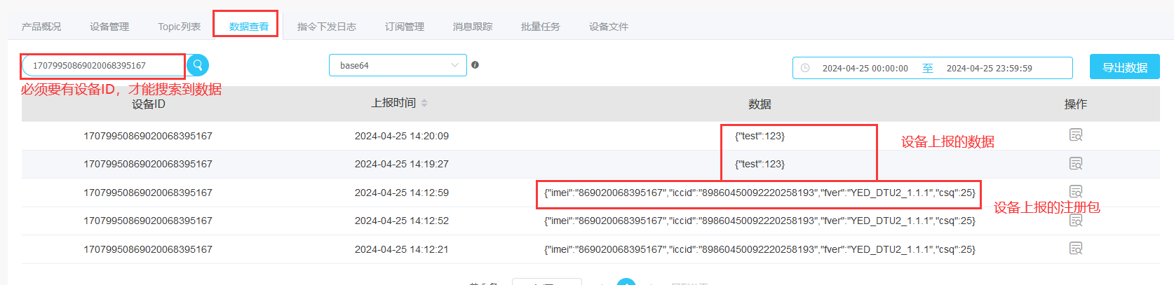 发送数据格式与创建产品选择的数据类型有关系,是json就必须json。使用串口发送数据给DTU,在云端查询日志。