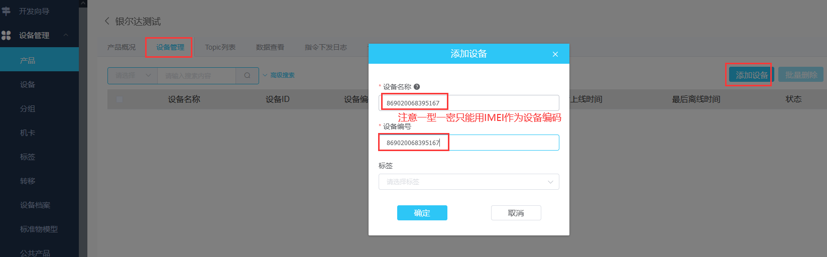 使用模块的IMEI编码,在后台添加设备。