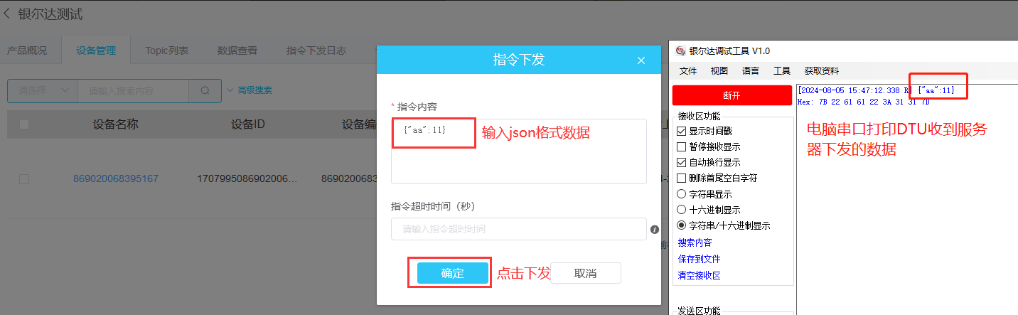 进入指令下发界面,调试设备。发送数据格式与创建产品选择的数据类型有关系,是json就必须json。