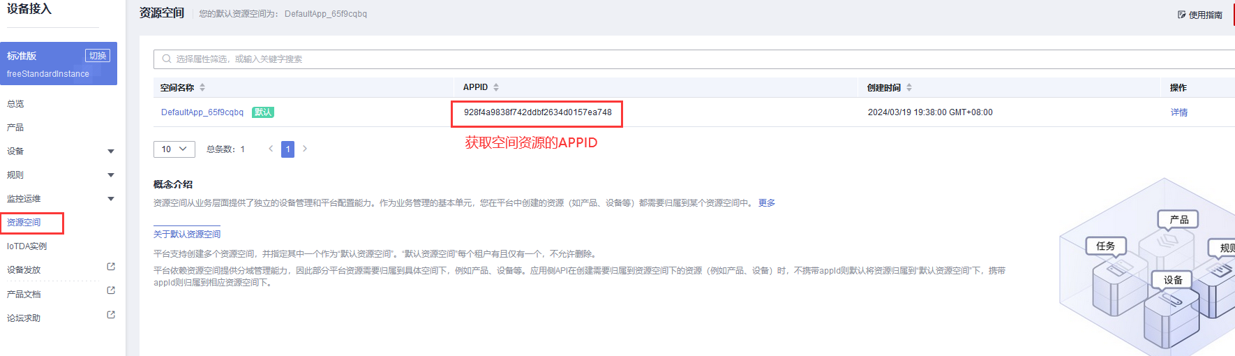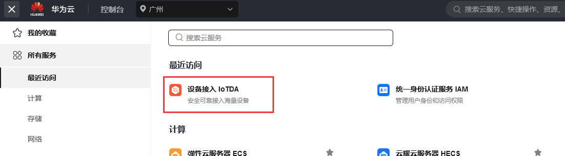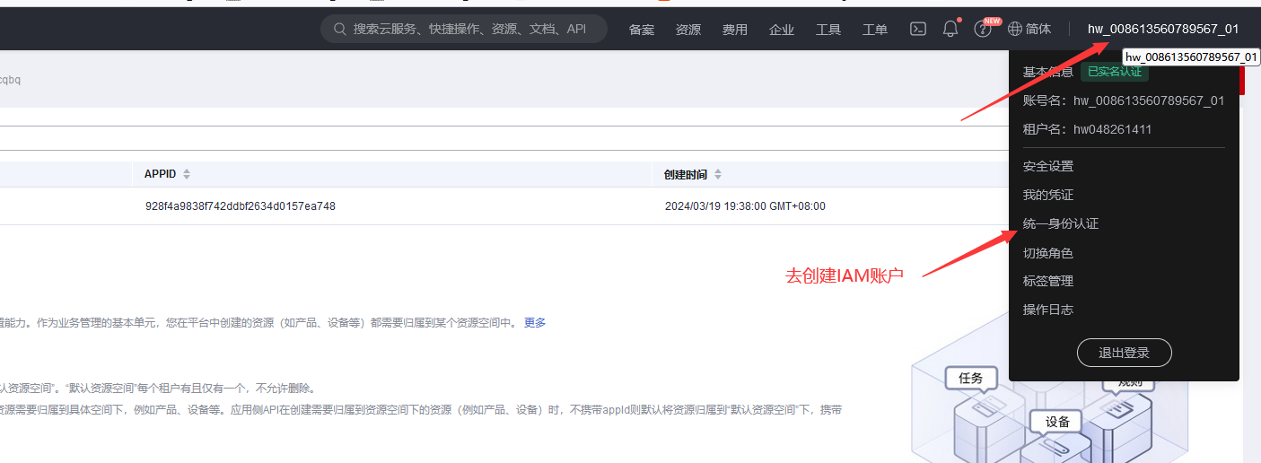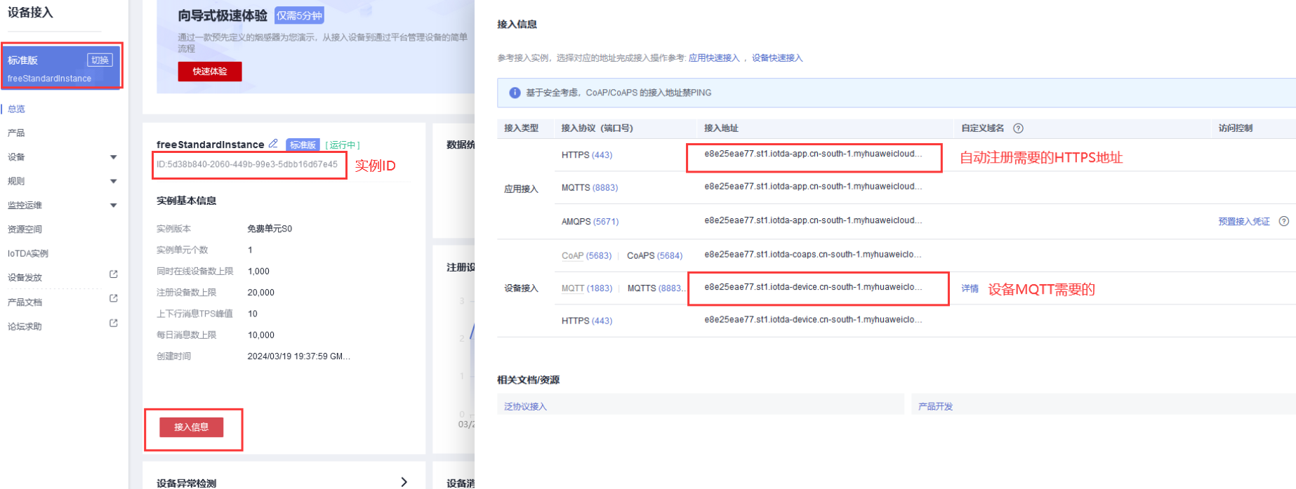 开通设备接入IoTDA服务,选择服务器区域,创建实例。在实例里面获取服务器地址和端口,实例ID,应用接入HTTPS地址,区域到时影响到IAM的服务器地址和IAM账号的项目ID和项目选择。