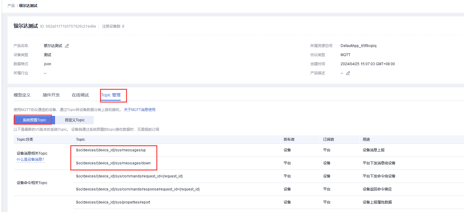 产品详情,topic管理里面,有个系统预制topic,这里我们使用透传的topic即可。