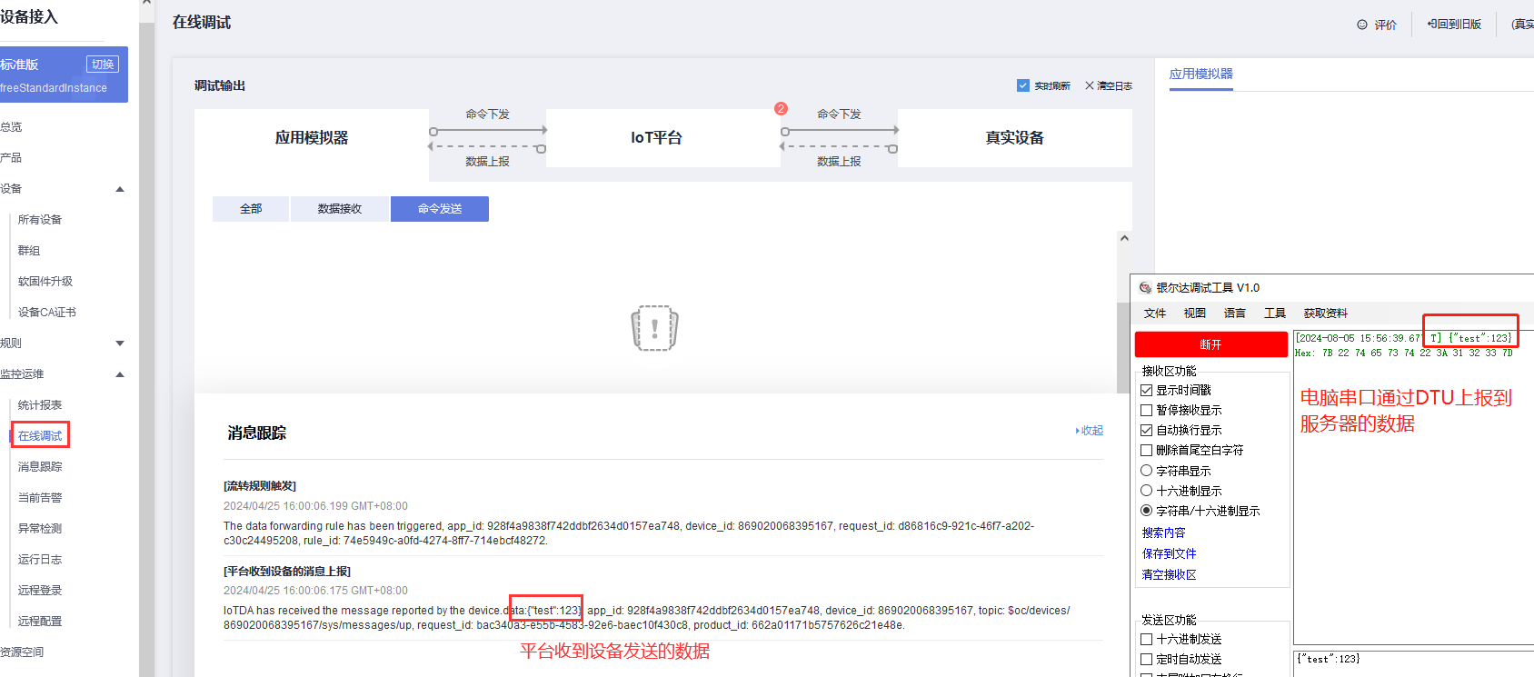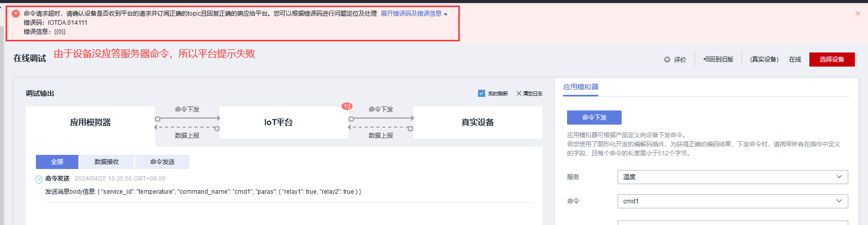 如果是纯透传topic,无法在控制平台发测试命令,需要调用API才能下发数据。如果使用物模型可以下发命令。