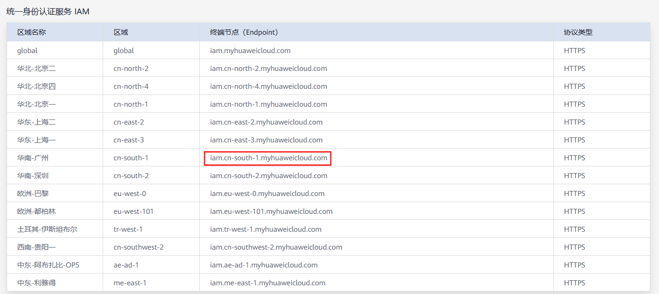 IAM服务器地址与账号区域有对应。选择连接:https://support.huaweicloud.com/api-iam/iam_01_0004.html
