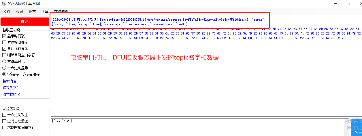 复制任务到DTUWEB平台,更新参数,控制台发送{"cmd":"on1"}控制继电器,{"cmd":"off1"}关闭继电器1。