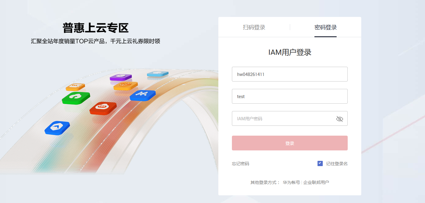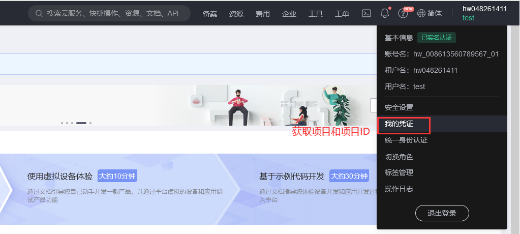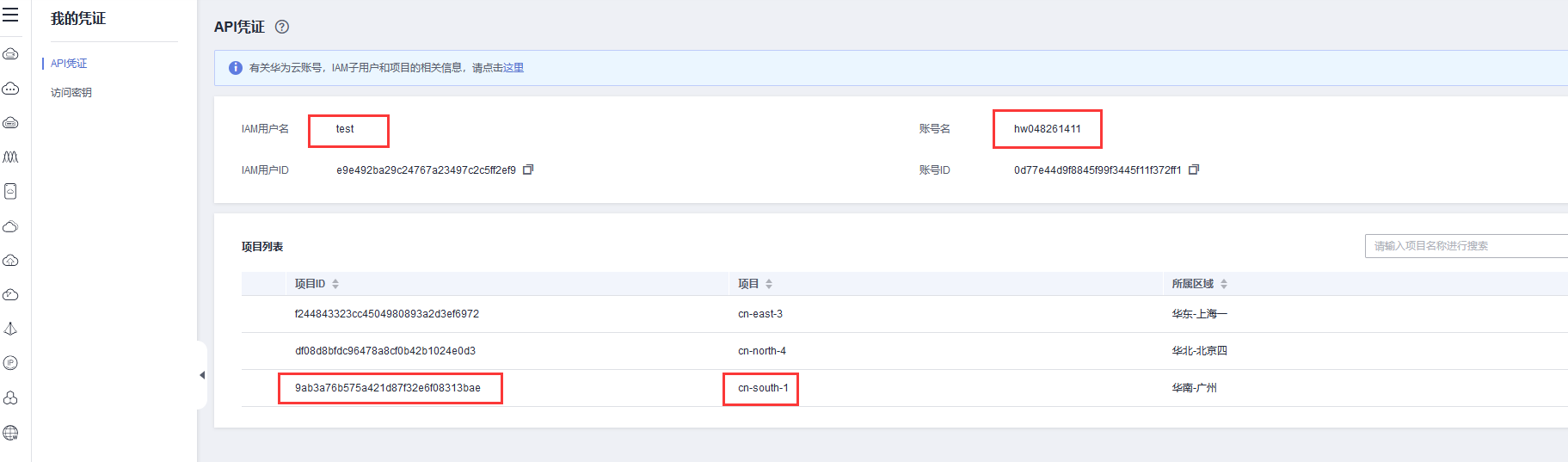 创建IAM账号后用IAM账号登录,账号信息,我的凭证,获取IAM用户名,账号名,项目,项目ID。项目和项目ID,与账号区域有对应。