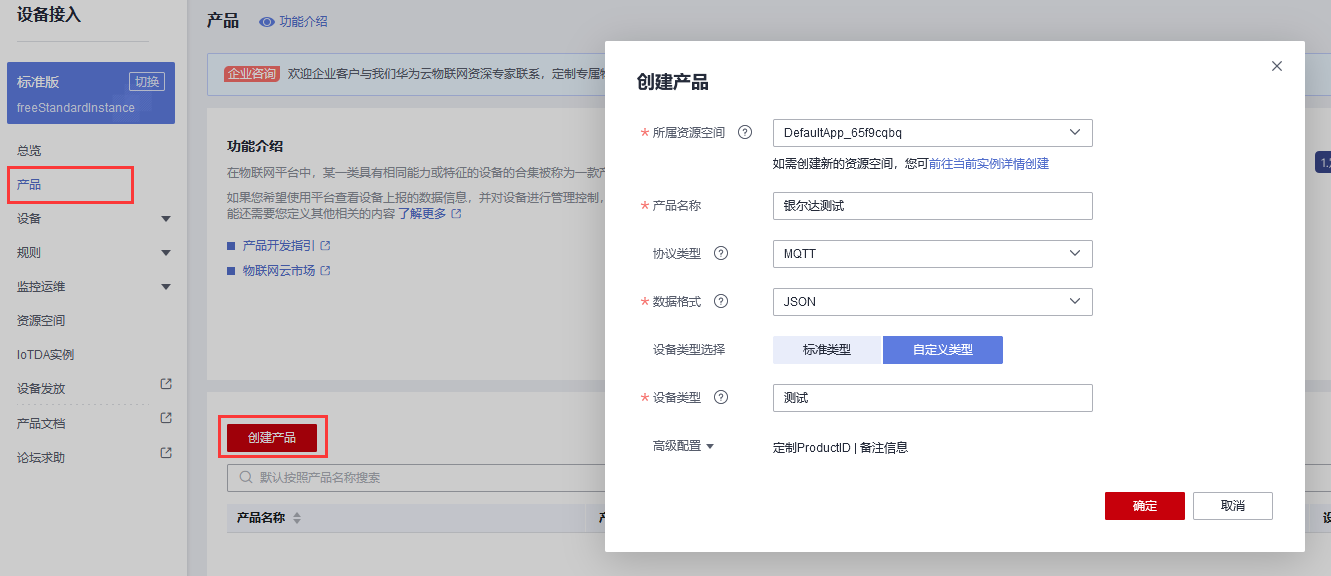 据需求选择,协议类型MQTT,数据格式,JSON,设备类型选择自定义,设备类型任意,测试。
