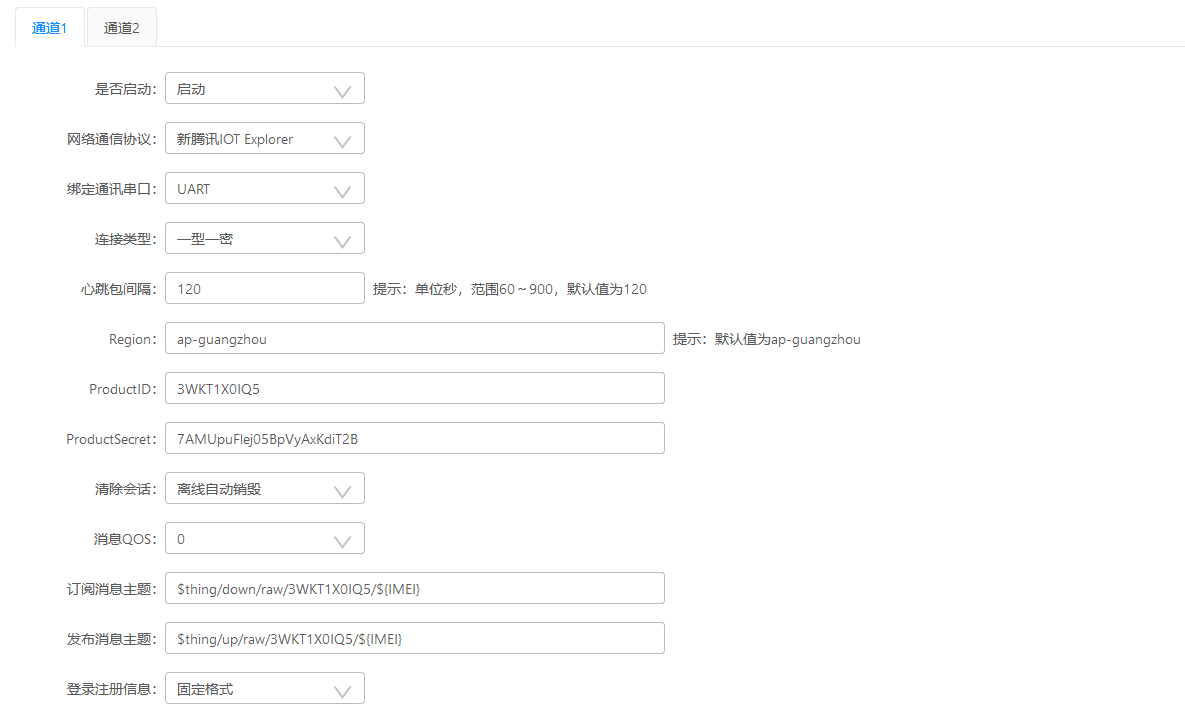 注意:腾讯IOT一型一密只能激活一次,激活后参数会保存到DTU flashe中,如果设备更换了产品信息,需要Reload按键清除设备里面保存的腾讯信息,否则连不上。