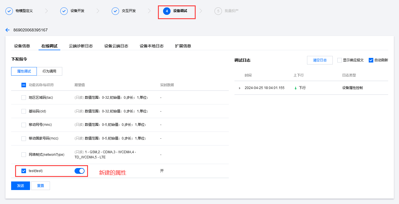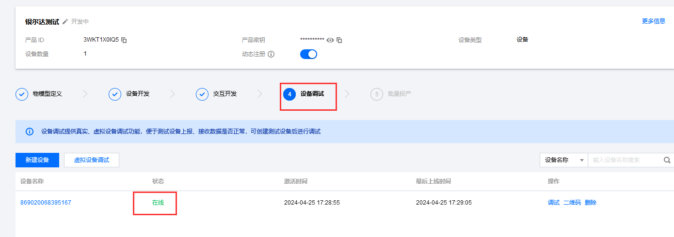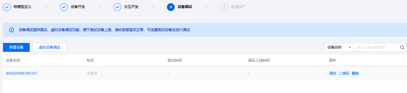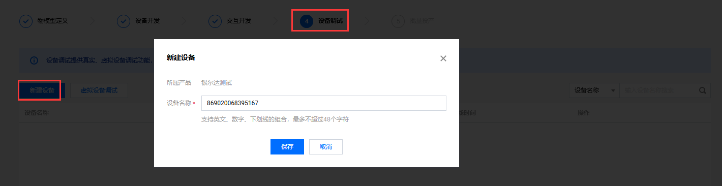 设备调试,新建设备,使用IMEI在平台提前添加设备。