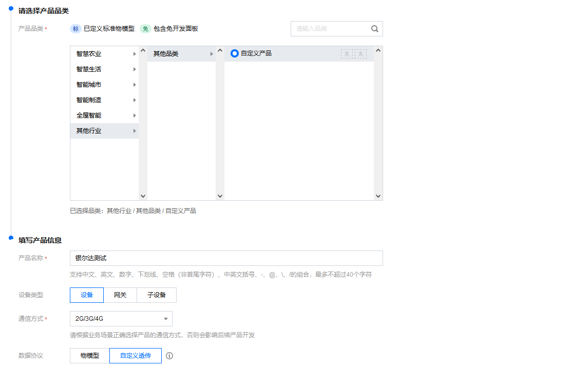 产品品类根据实际选择,这里选其他行业,自定义产品,设备类型选择设备,通讯方式选择2G/3G/4G,数据协议选择透传。
