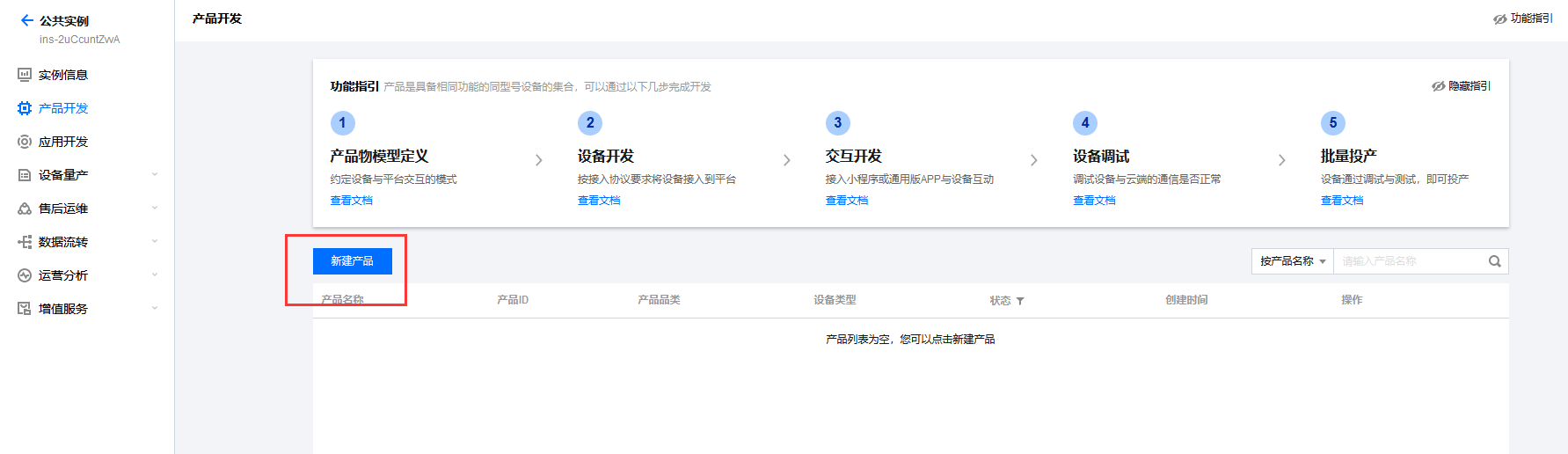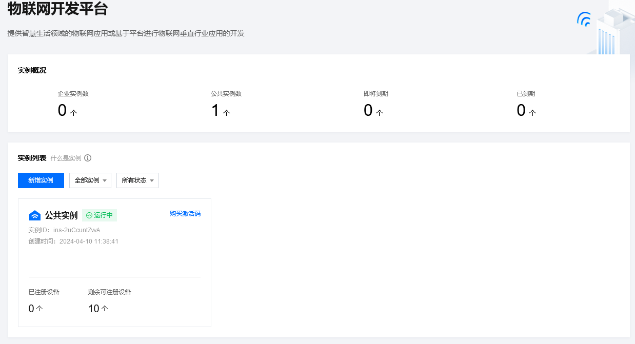 开通IOT服务,新增实例。这里以公共实例为例,这个默认有10个设备可以连接。