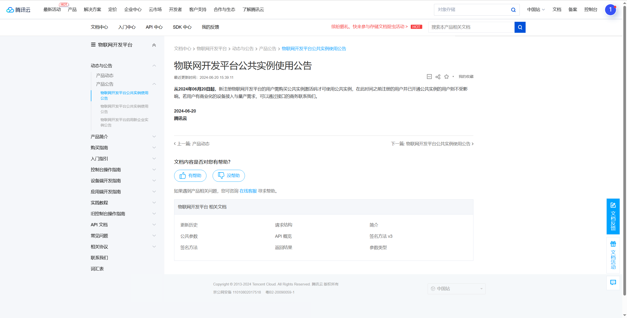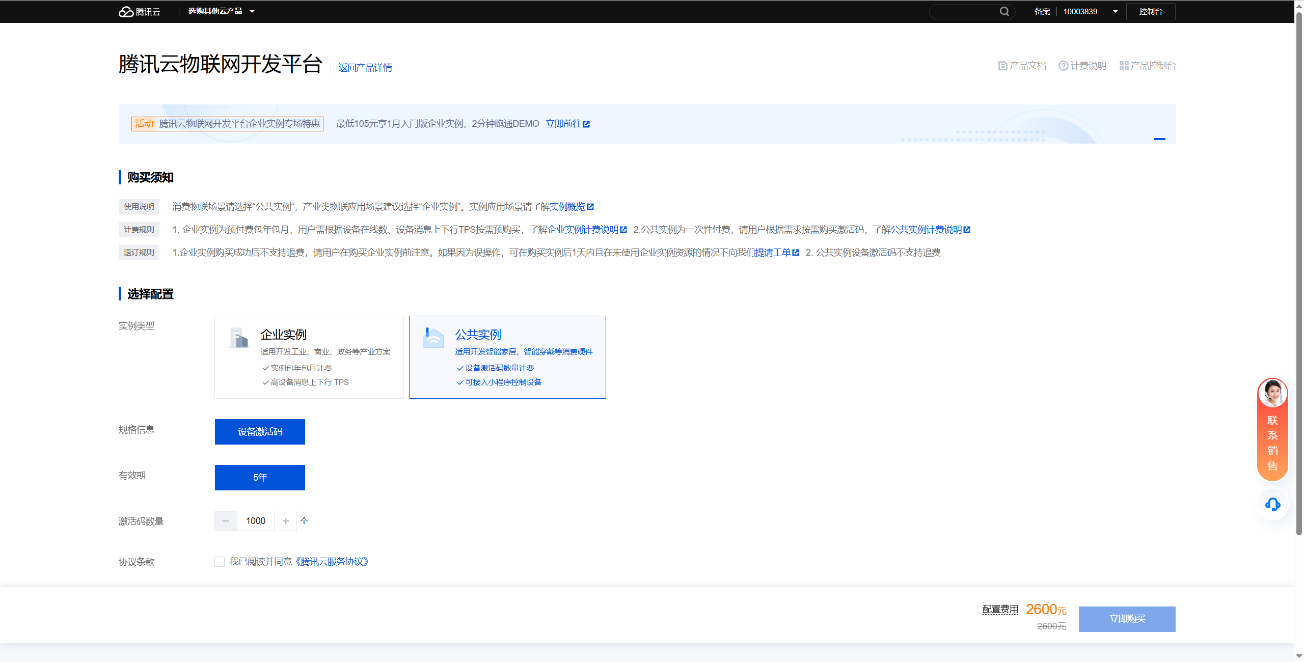 腾讯云发布公告,从2024年06月20日起,新注册物联网开发平台的用户需购买公共实例激活码才可使用公共实例,在此时间之前注册的用户并已开通公共实例的用户则不受影响。所以此链接方式只适合于2024年06月20日前注册账号的用户,此日期之后注册的账户,不再提供免费公共实例,需要在腾讯云付费购买。