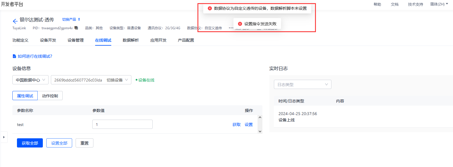 在线调试,选择对应设备调试直接发送数据,服务器会提示未设置解析脚本错误,因为设备是自定义透传协议,所有需要再涂鸦云编写脚本,才能传送数据。