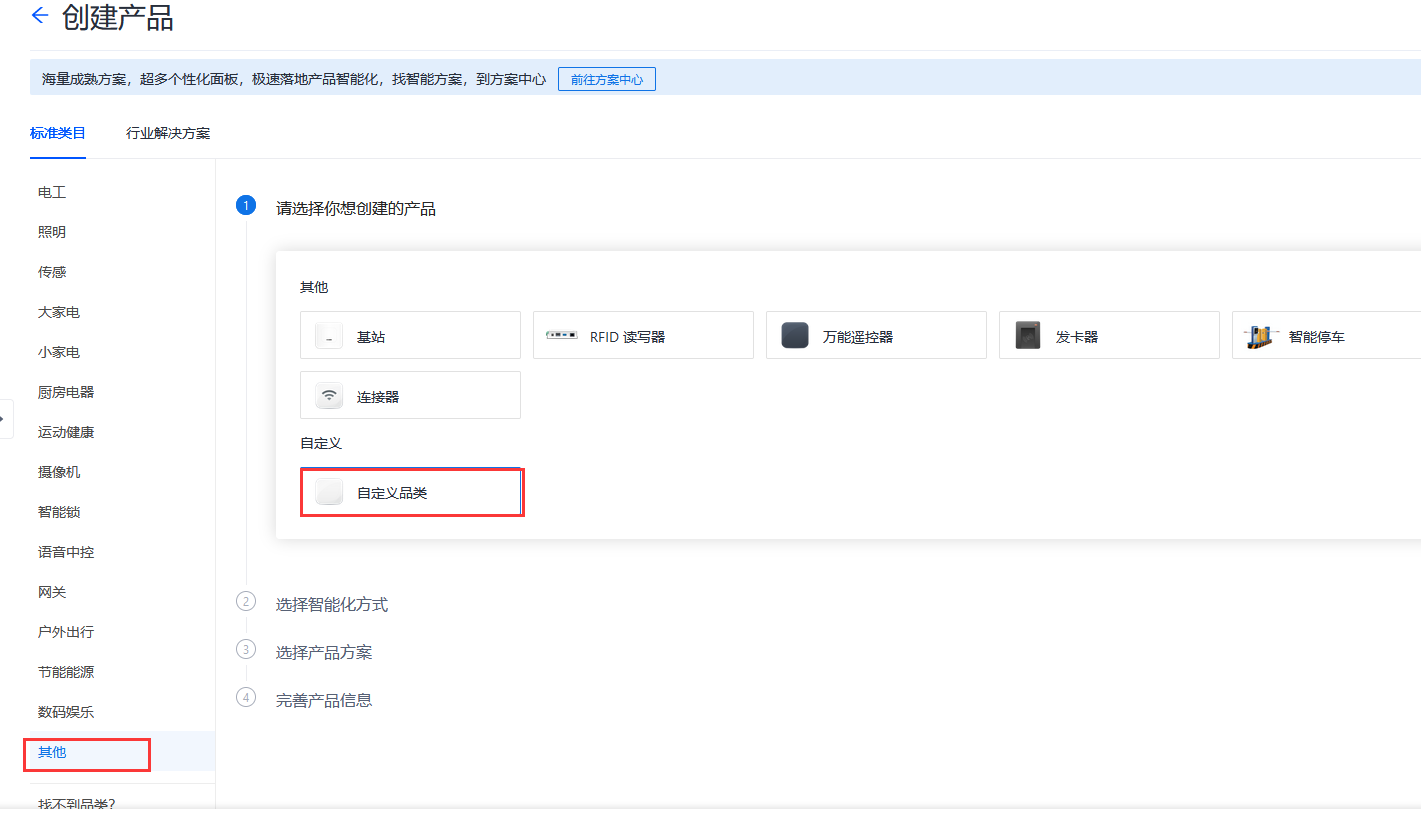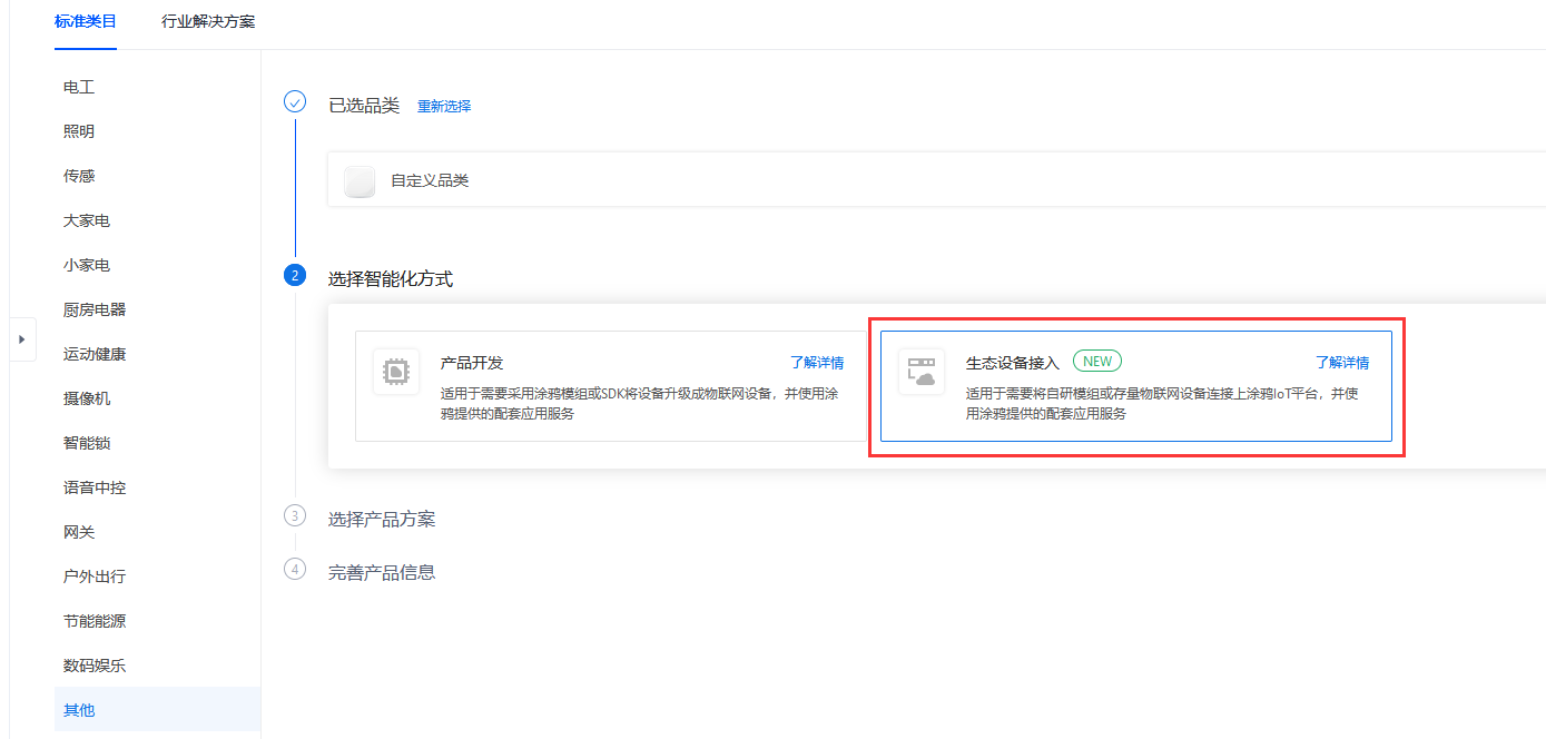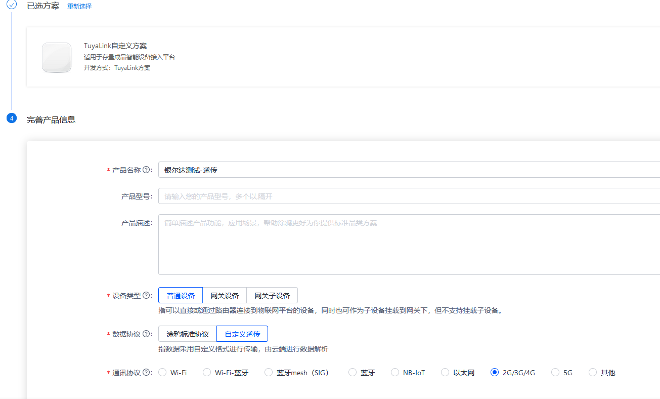 产品,创建产品,根据需求选择。标准品类选择其他,自定义品类,生态设备接入,设备类型选择普通设备,数据协议选择涂鸦标准协议,通讯协议选择2G/3G/4G