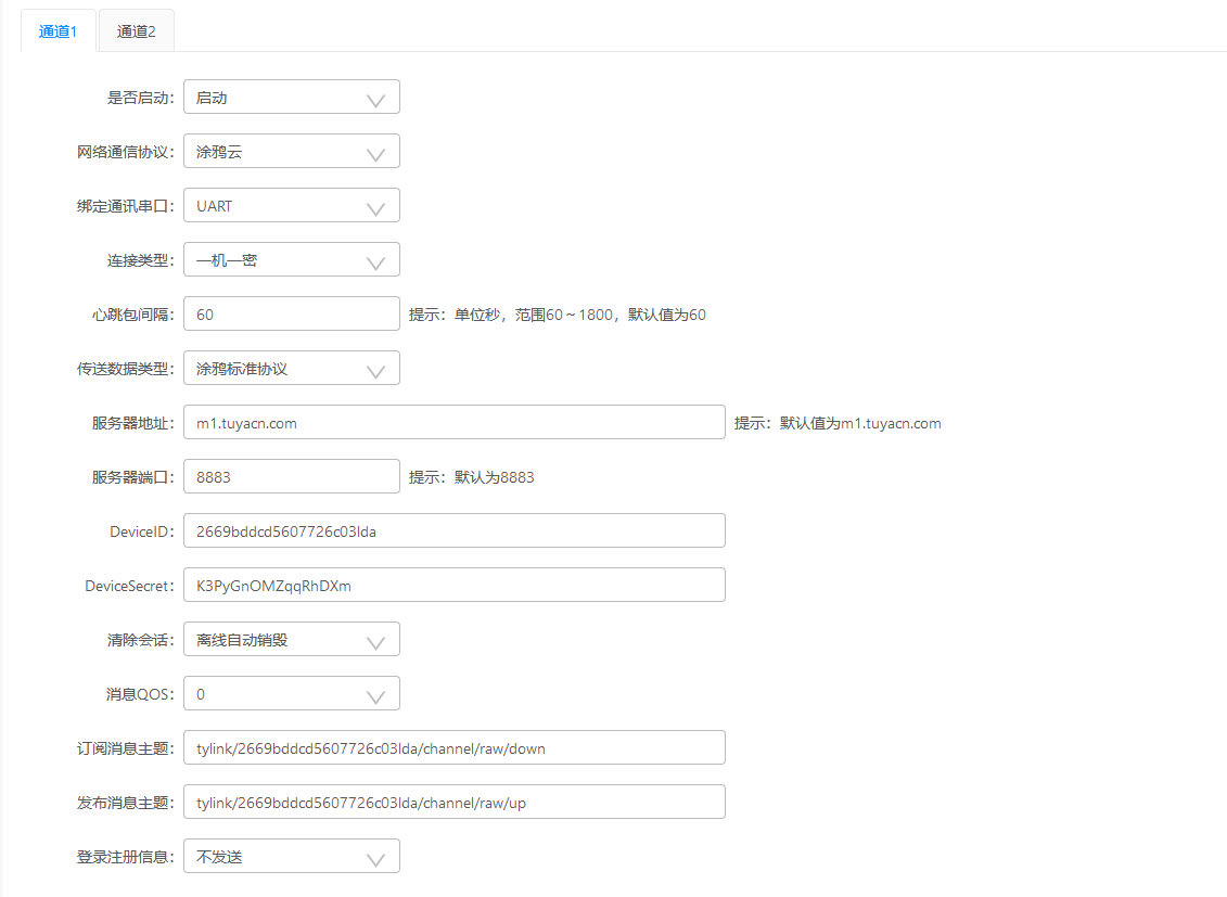 DTU发布消息主题填写:tylink/2669bddcd5607726c03lda/channel/raw/up