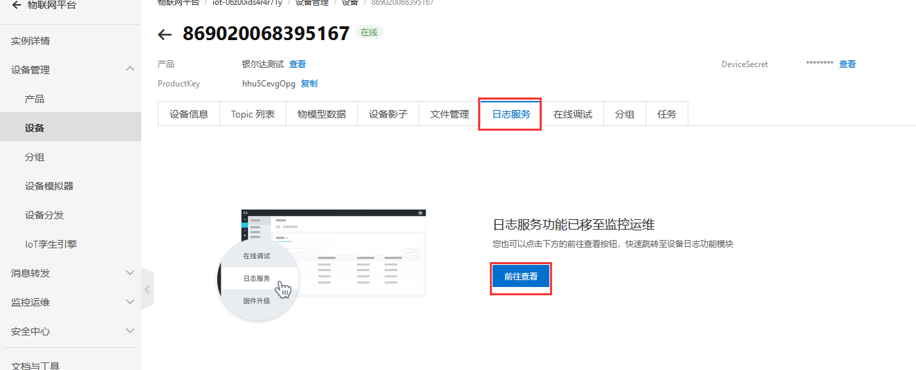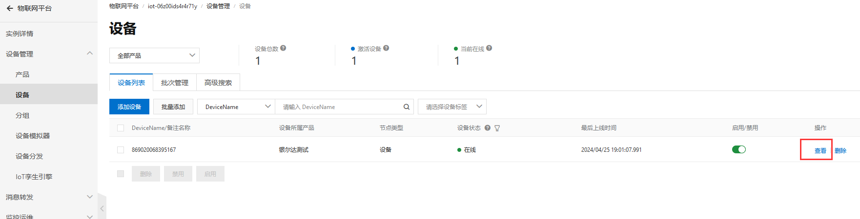 设备列表,查看,进入设备详情,topic列表,可以看到设备订阅的topic,在这里发送调试数据。