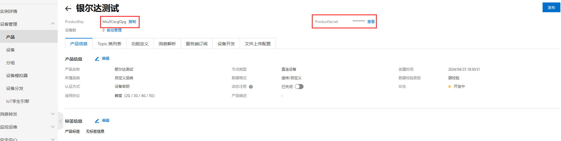 进入连接:https://iot.console.aliyun.com。整体流程是创建产品,配置参数,更新参数,使用任务处理topic。