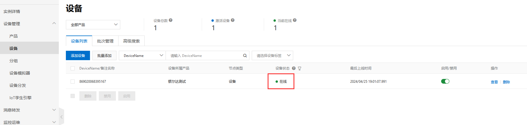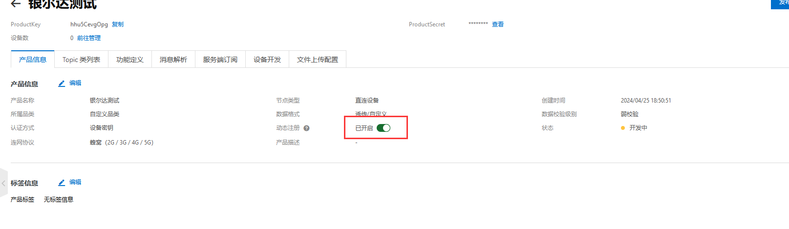 注意:阿里IOT一型一密只能激活一次,激活后参数会保存到DTU flash中,如果设备更换了产品信息,先删除阿里云平台的设备,然后再重新添加设备,然后DTU Reload按键清除设备里面保存的阿里信息,重新获取参数后,连接阿里云,否则连不上。