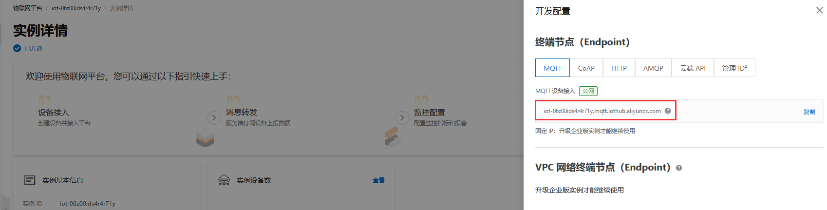 进入设备详情,查看开发配置,获取MQTT服务器地址信息