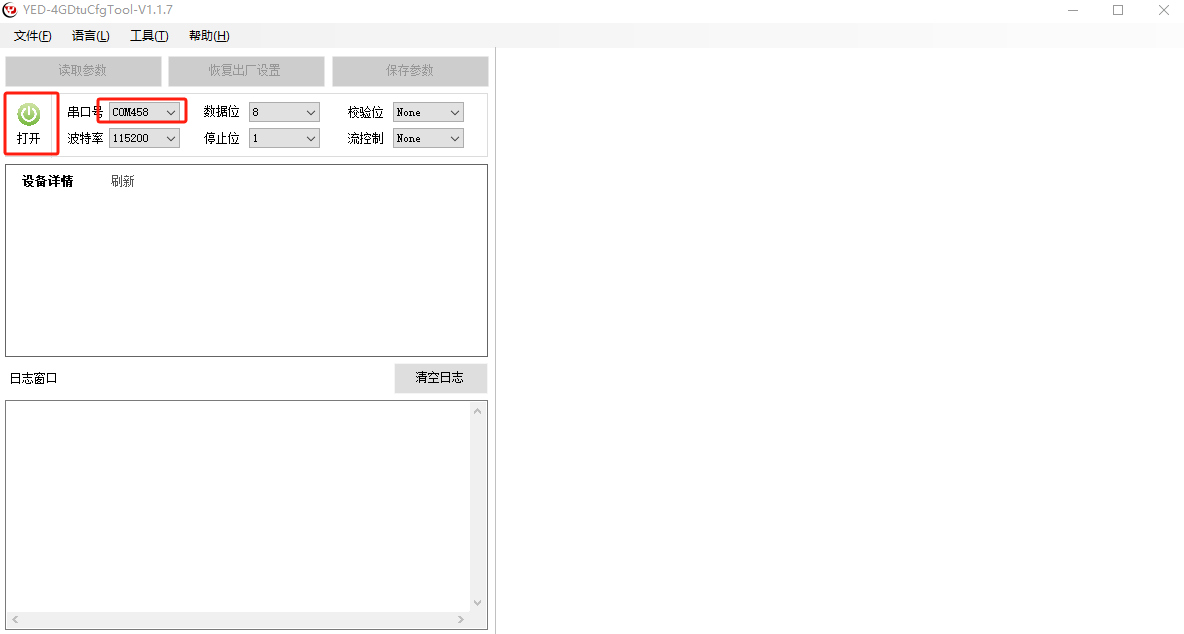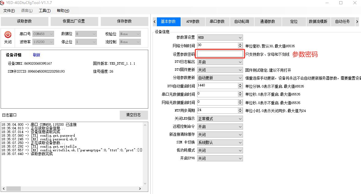 点击运行4GDtucfg.exe程序,选择串口号,点击打开,设备设置密码可以直接读取参数,如果设置了密码需要验证密码才能读取。密码是用来保护参数不被非法读取。