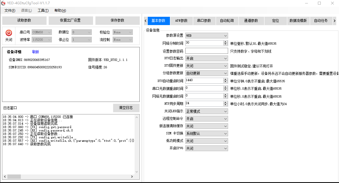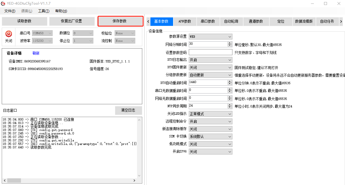配置参数后,点击保存参数,设备自动重启,参数生效。