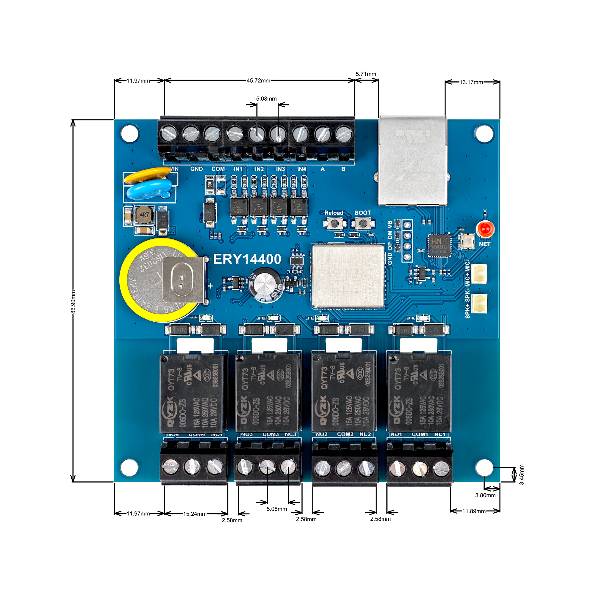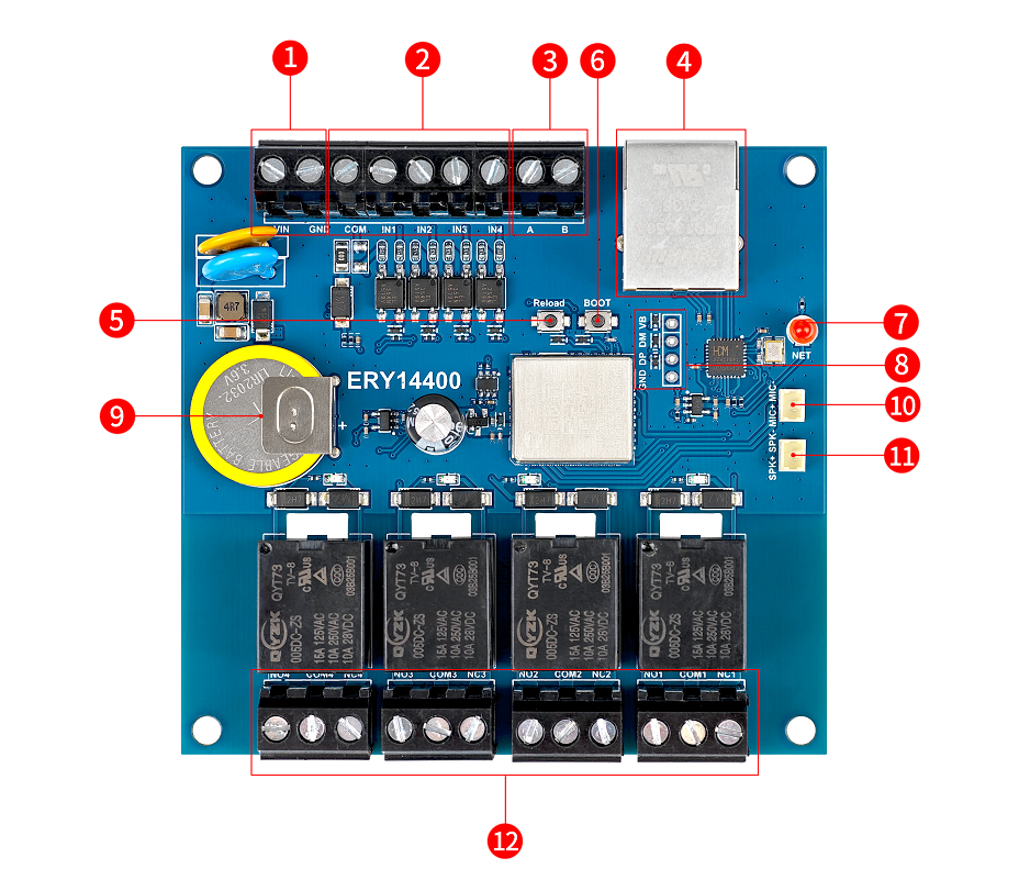 | 2 | COM IN1-IN4 | 2路干接点输入 | 默认IN和COM导通触发输入 COM是高电平其电压等于设备供电电压 支持切换电阻改成湿节点触发 |