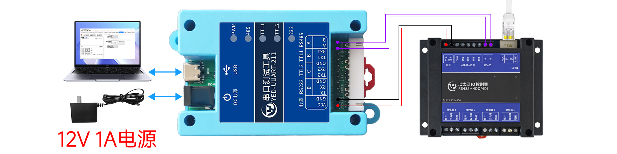 模块的VIN GND 接7~36V,10W的电源(不能用USB转串口那种电脑USB供电,功率不足);RS485 A接A,B接B;推荐使用银尔达的YED-UUART-211测试工具测试,方便供电和串口连接调试。