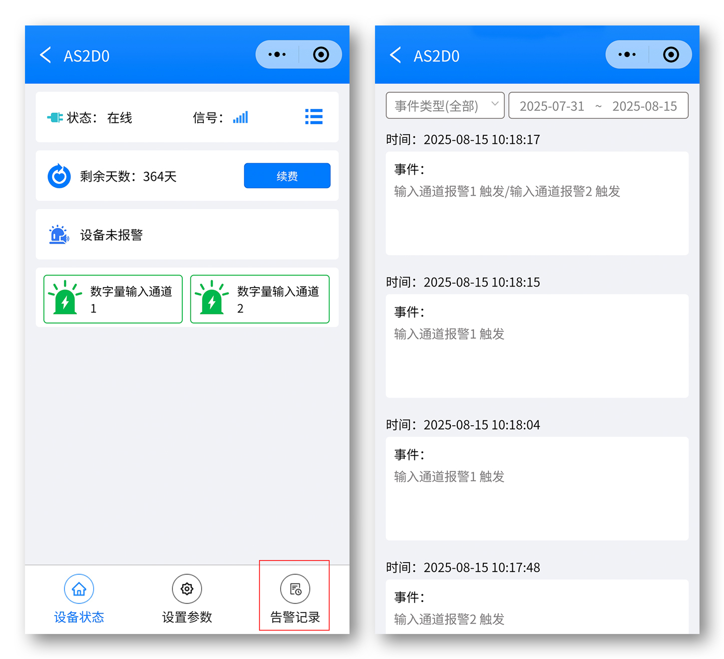 在【设备状态】界面,点击【告警记录】可以切换到记录查看界面