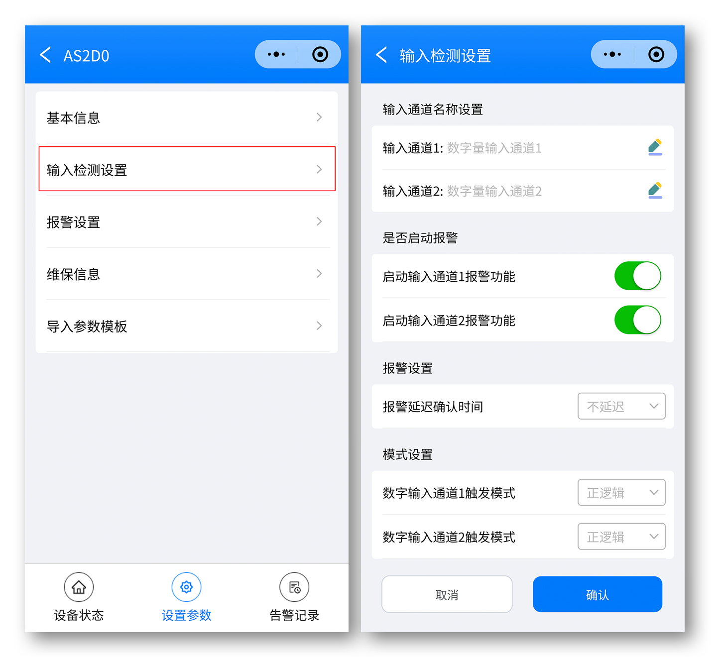 - 模式设置:支持(正逻辑、反逻辑)两种方式,当你设备外部的输入报警信号是相反的情况下可以使用该功能进行信号状态的切换