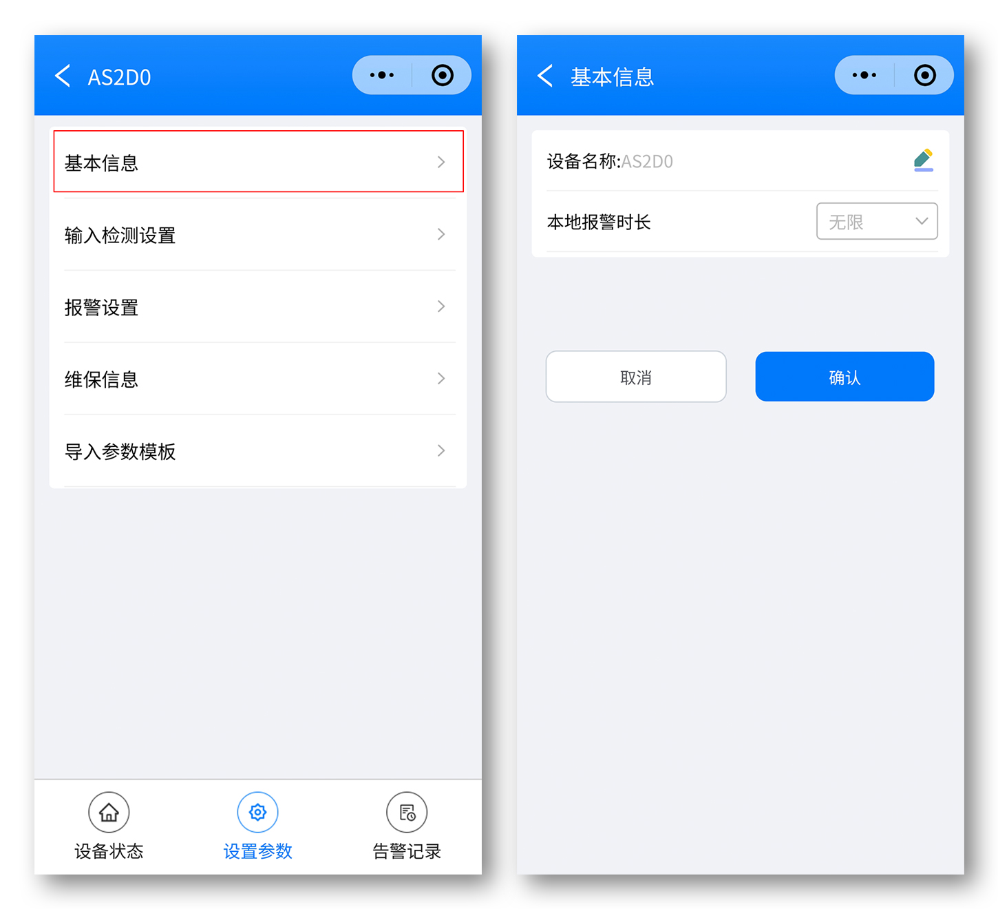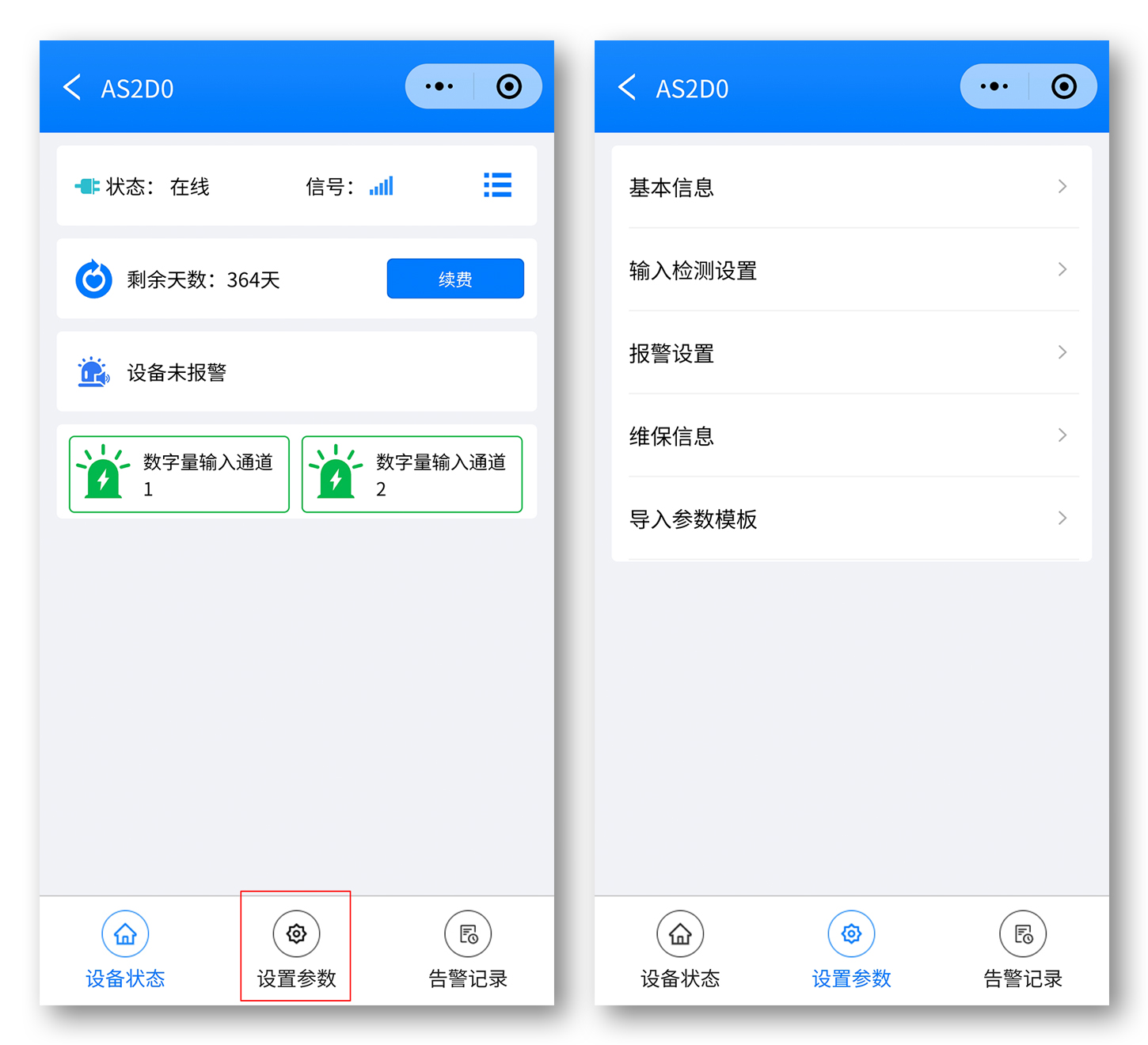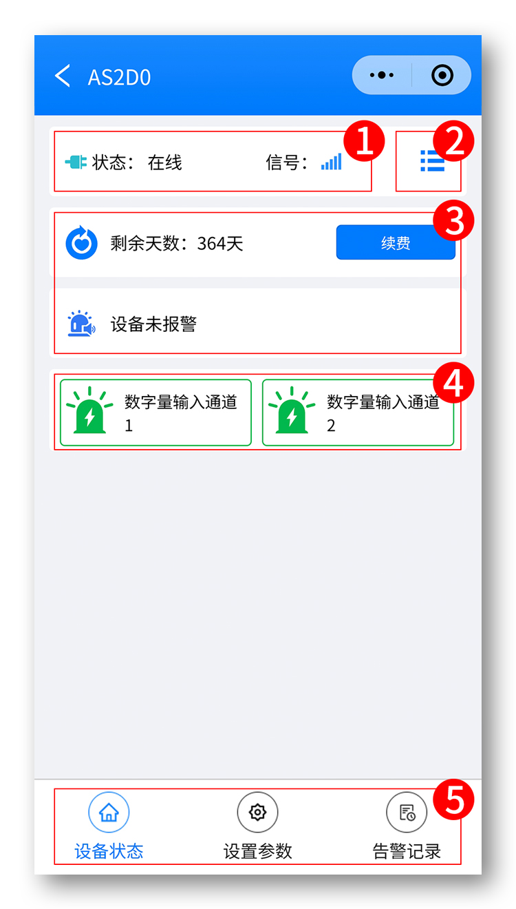 - 功能切换区域,可以在【设备状态、设置参数、告警记录】界面来回切换