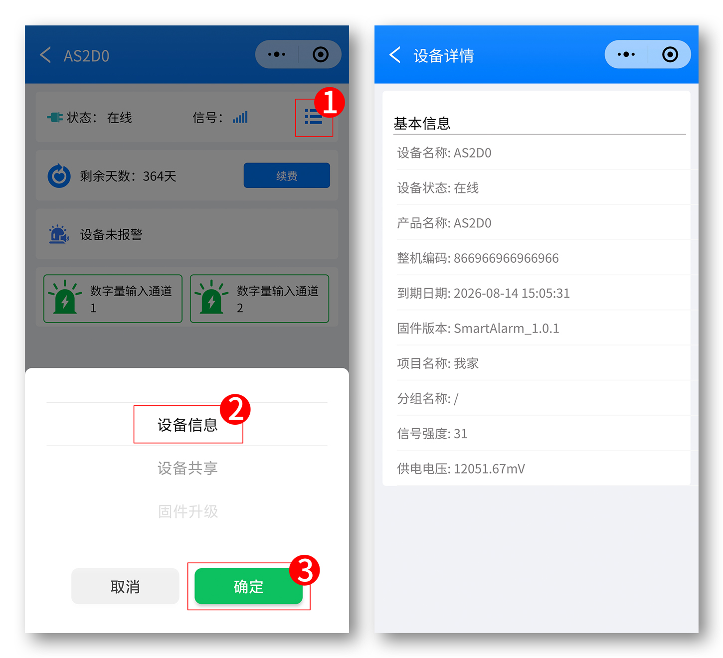 点击设备控制界面上的箭头 ① 的区域,弹出选择菜单,点击【设备信息】点击【确定】进入设备详情页面,在这里可以看到设备当前的一些基本信息。