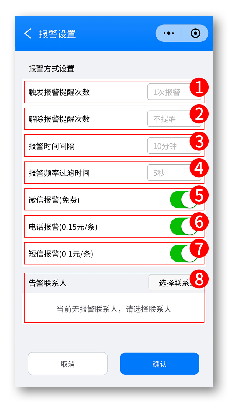 - 报警联系人: 选择当设备报警后(微信、短信、电话)需要通知的人员