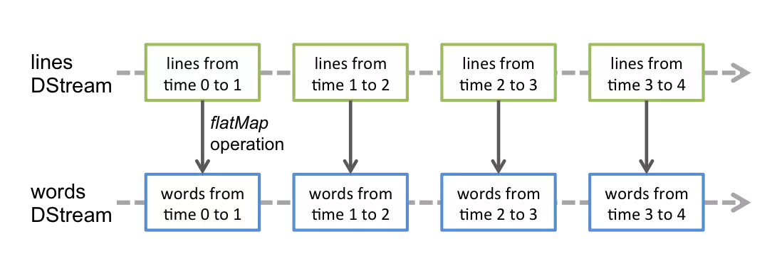 map(func):将源DStream中的每个元素通过一个函数func从而得到新的DStreams。