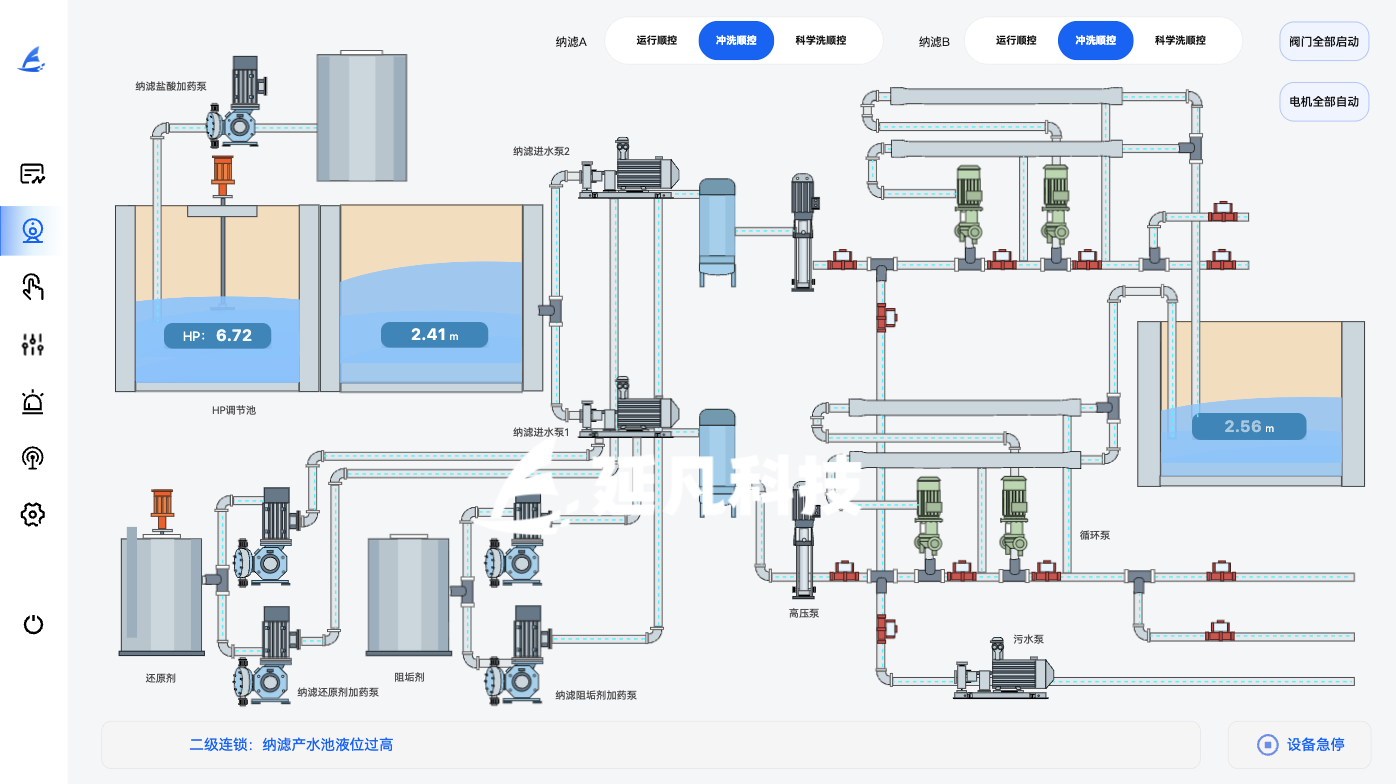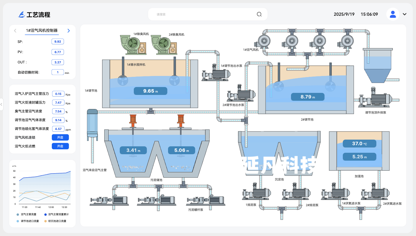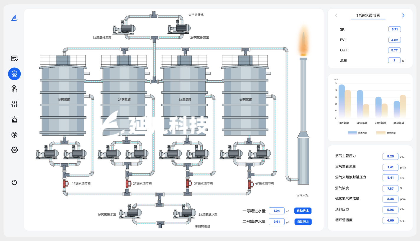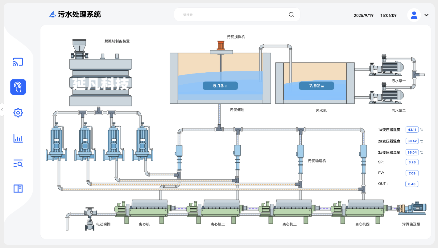 - 远程运维:手机 / 电脑管设备,减少人工支持远程查看设备状态(如水泵是否故障、沉淀池污泥液位),一键启停设备;自动生成报表(如 “每日处理水量 5000 吨,出水达标率 100%”),无需人工统计。