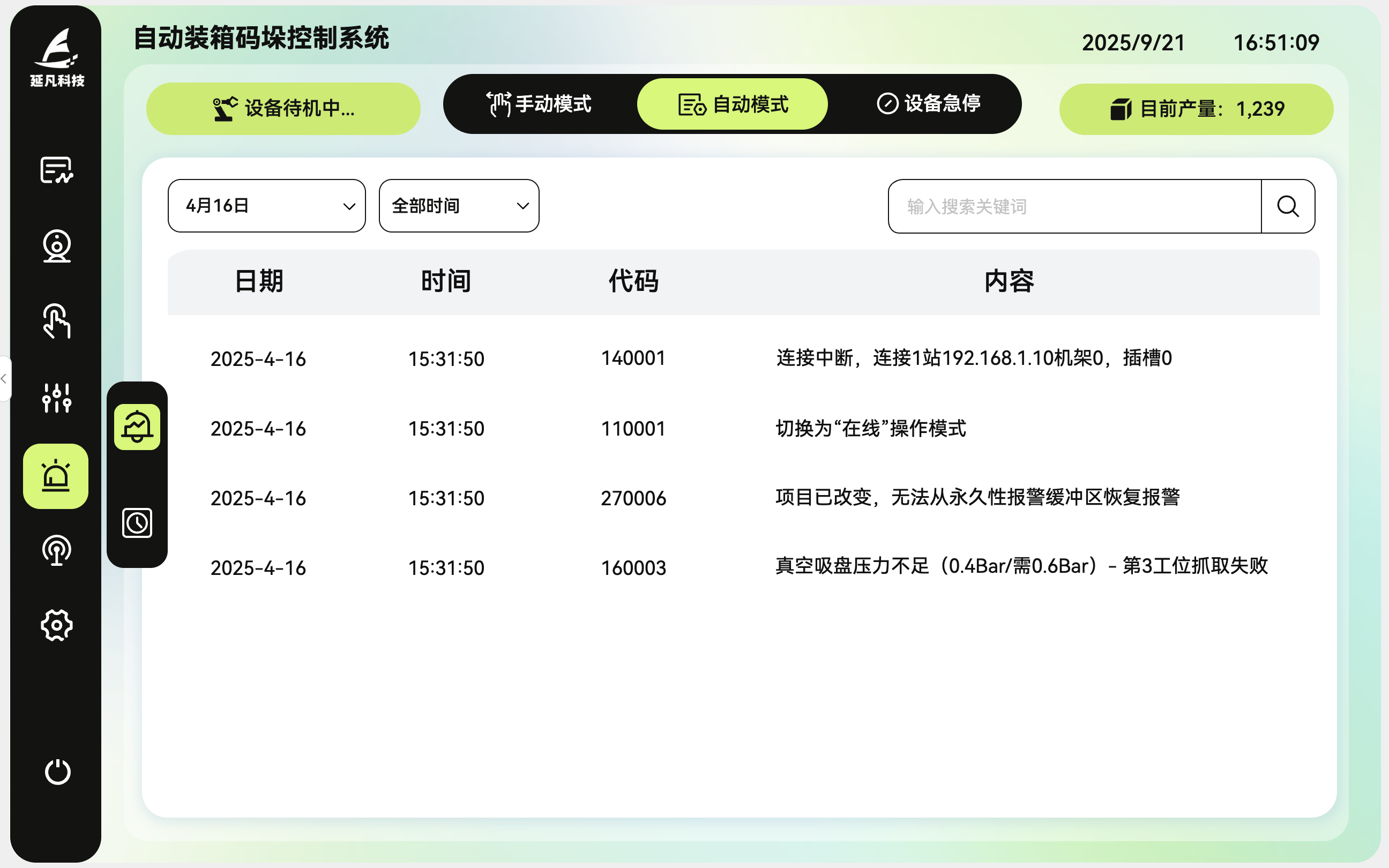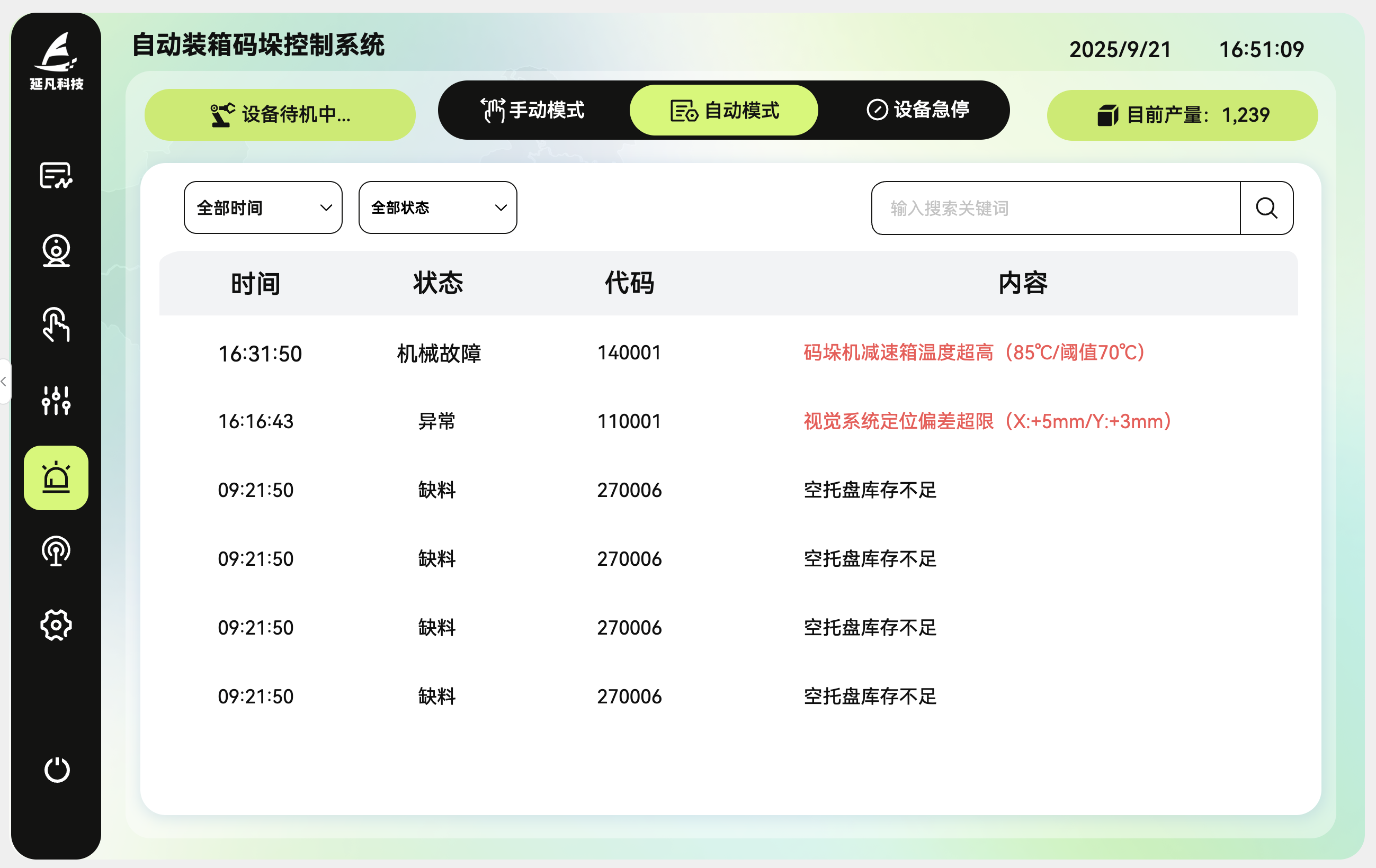 - 数据追溯:系统记录每批物料的 “装箱时间、码垛时间、操作人员、设备状态、不合格数量” 等数据,可通过 HMI 或对接 MES 系统查询,便于质量追溯与生产分析。