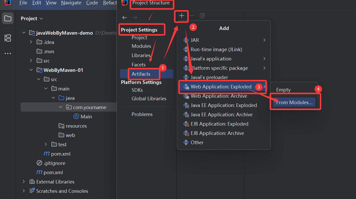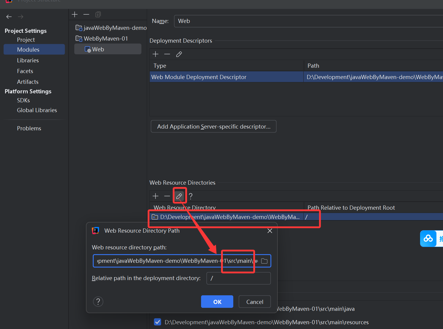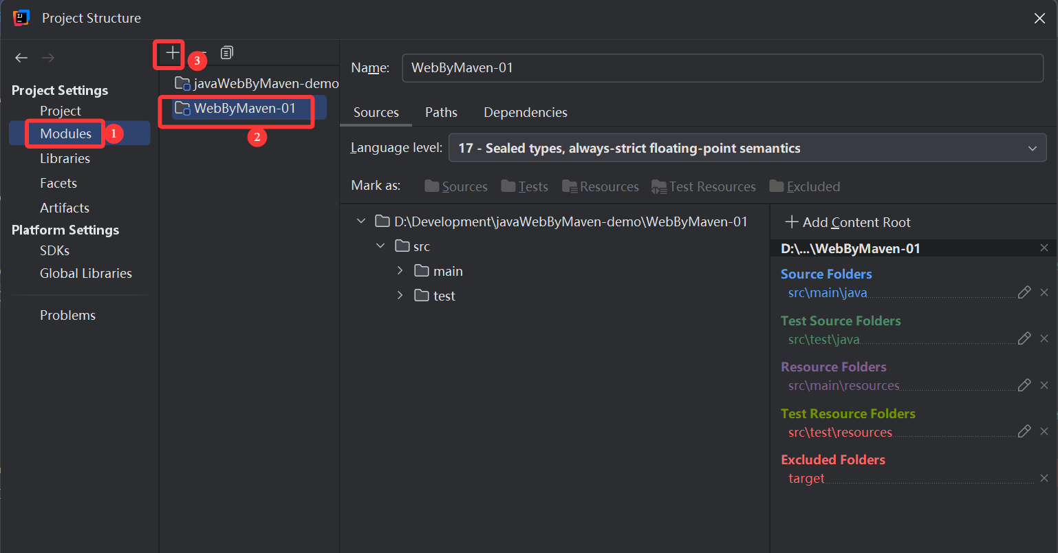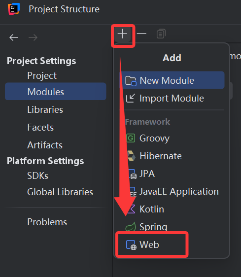 选择modules-子模块WebByMaven-01,点击 + ,选择web