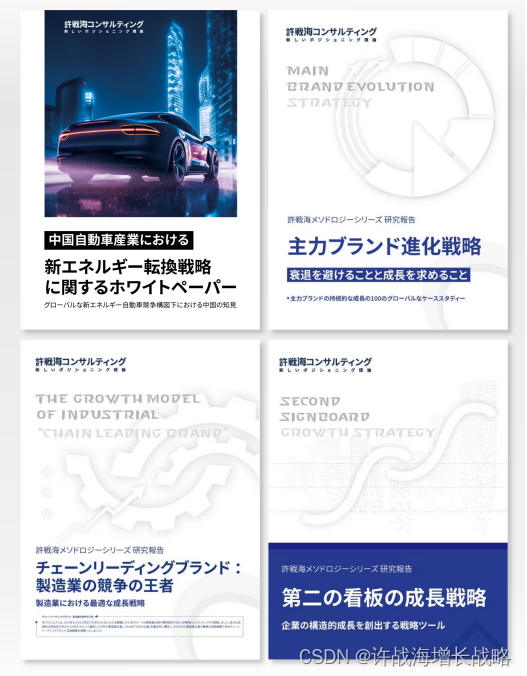 许战海咨询发布了《中国汽车行业新能源转型战略》等多本白皮书,为日本和中国市场提供转型参考,涵盖主品牌进化、链主品牌等策略,助力企业在快速变化的竞争中实现增长。