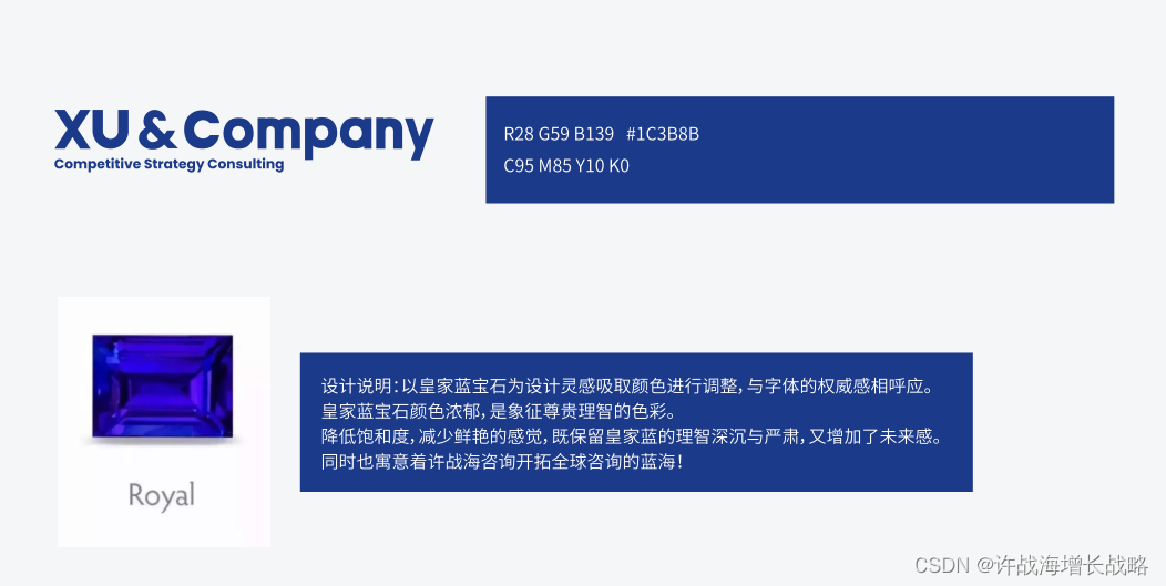 皇家蓝宝石色同时也隐喻着许战海咨询的宏伟愿景:勇敢开拓全球战略咨询的无垠蓝海,在全球产业科技的蓝海中贡献中国战略智慧。