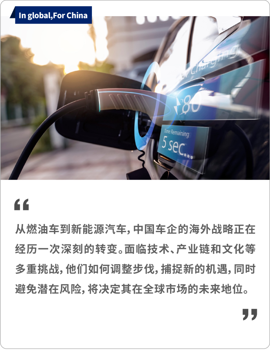 中国车企正在从燃油车时代的物美价廉转向新能源汽车的全球产业链布局和技术输出。他们需应对技术升级、市场选择和文化差异等挑战,以抓住新能源市场的机遇。
