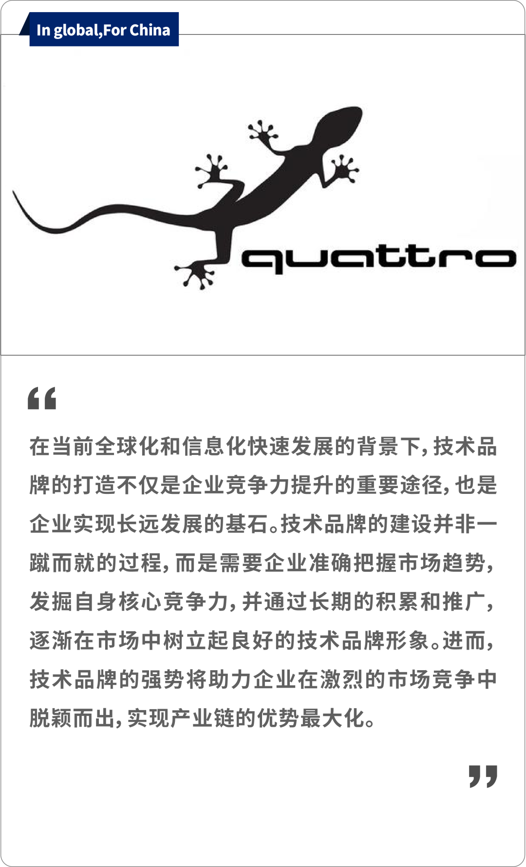为了进一步提升Quattro全时四驱系统的传播广度,奥迪在Quattro诞生25周年时,设计了专属的壁虎Logo,这种以极具象征意义的动物载体传播的方式,加速了Quattro技术品牌在泛大众中的普及,逐渐成长为整个品牌的技术图腾。同时,通过“Vorsprung durch Technik”(技术领先)的品牌口号,奥迪强调了其技术的先进性和领先性,进一步加深了消费者对Quattro技术品牌的认知和理解。
